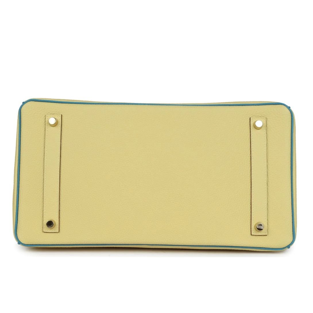 This Special Order Birkin is crafted from a luxurious combination of Jaune Poussin and Bleu Paradise togo leather, accented with brushed gold hardware. It features tonal stitching, a front flap, two straps with a center toggle closure, a clochette with lock and two keys, and double rolled handles.