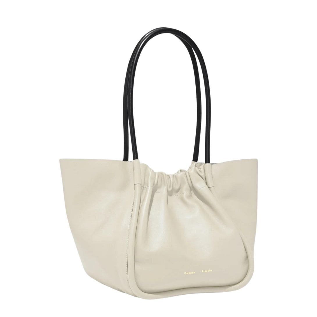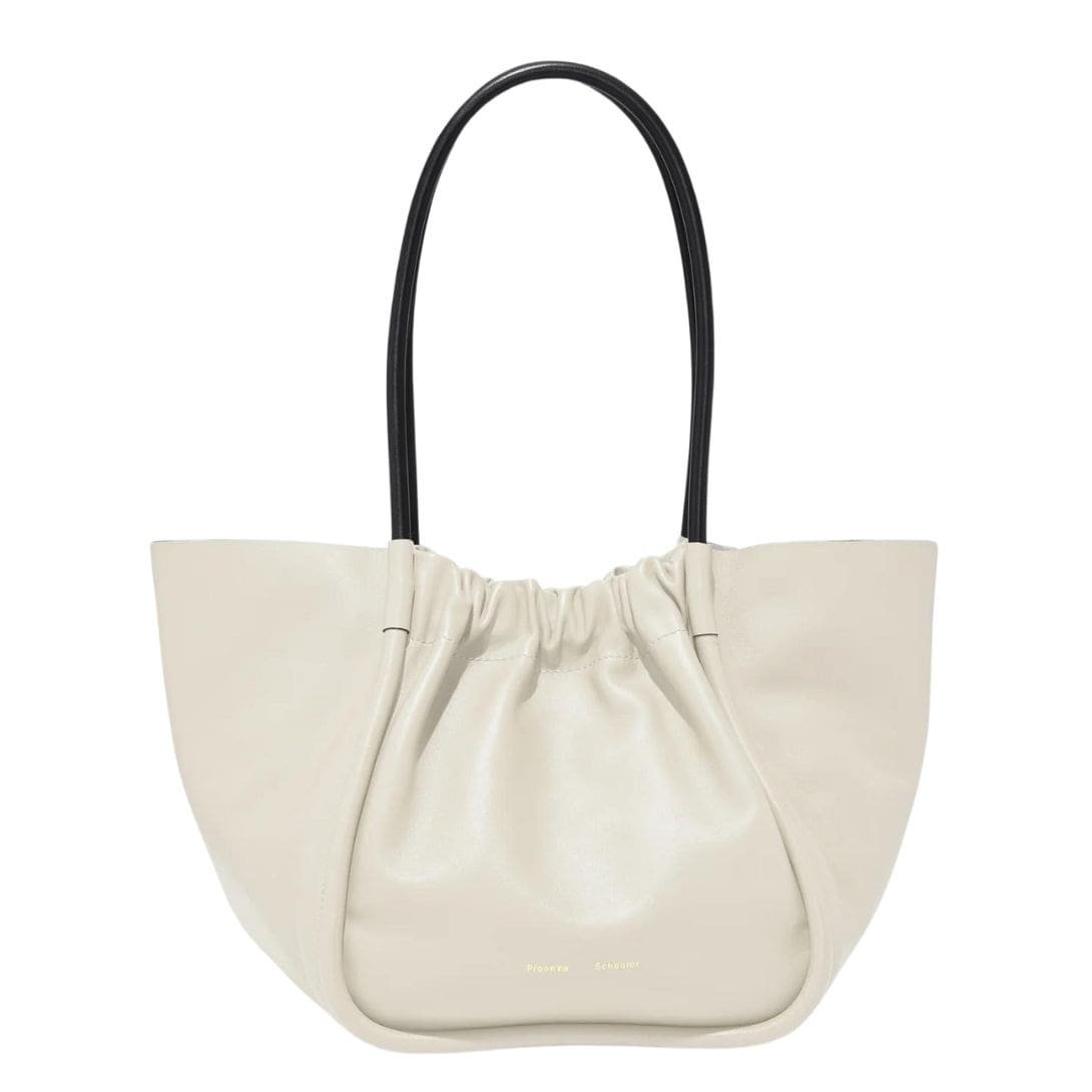 In the expansive Tote family, the Large Ruched Tote stands as a symbol of understated luxury and timeless style. Its off-white hue adds a touch of pristine charm, elevating any ensemble with its understated allure. Paired with two sleek black handles, this tote exudes a sense of understated sophistication, offering both style and comfort for the modern individual.