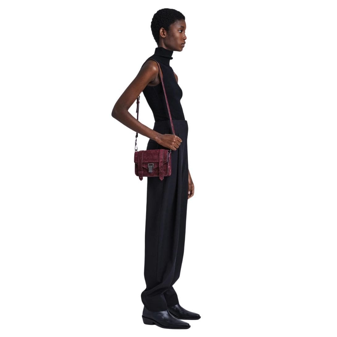 The Suede Proenza PS1 Mini Crosbody Bag In Suede Bordeaux. epitomizes a harmonious blend of vintage charm and contemporary functionality, drawing inspiration from the rugged elegance of traditional workwear satchels. Crafted with meticulous attention to detail, this exquisite accessory is a testament to Proenza Schouler’s commitment to quality and style.