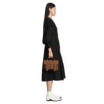 Silver-tone metal hardware accents the design, lending a contemporary touch and complementing the rich walnut brown suede with a subtle shimmer. Crafted from 100% calfskin leather, the PS1 Tiny Bag exemplifies the brand’s dedication to superior craftsmanship and quality. Its supple texture promises to age gracefully, developing a unique patina over time that reflects the wearer’s individuality and journey.