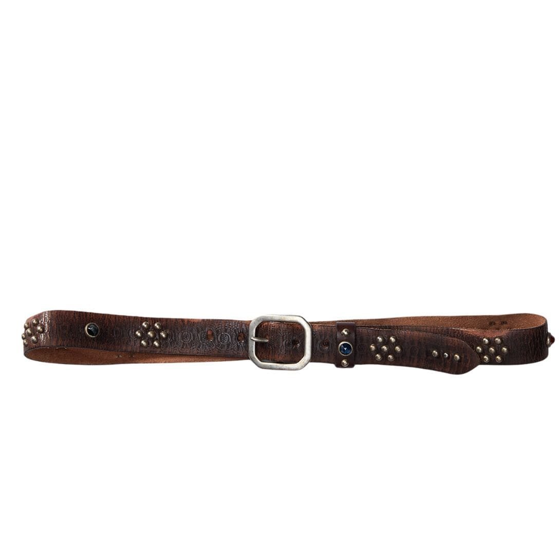 Each stud is strategically positioned along the length of the belt, creating a striking visual contrast against the smooth leather backdrop. These embellishments, meticulously crafted to perfection, elevate the belt from a mere accessory to a statement piece. The gleam of each stud catches the light, commanding attention and adding a touch of glamour to any ensemble.