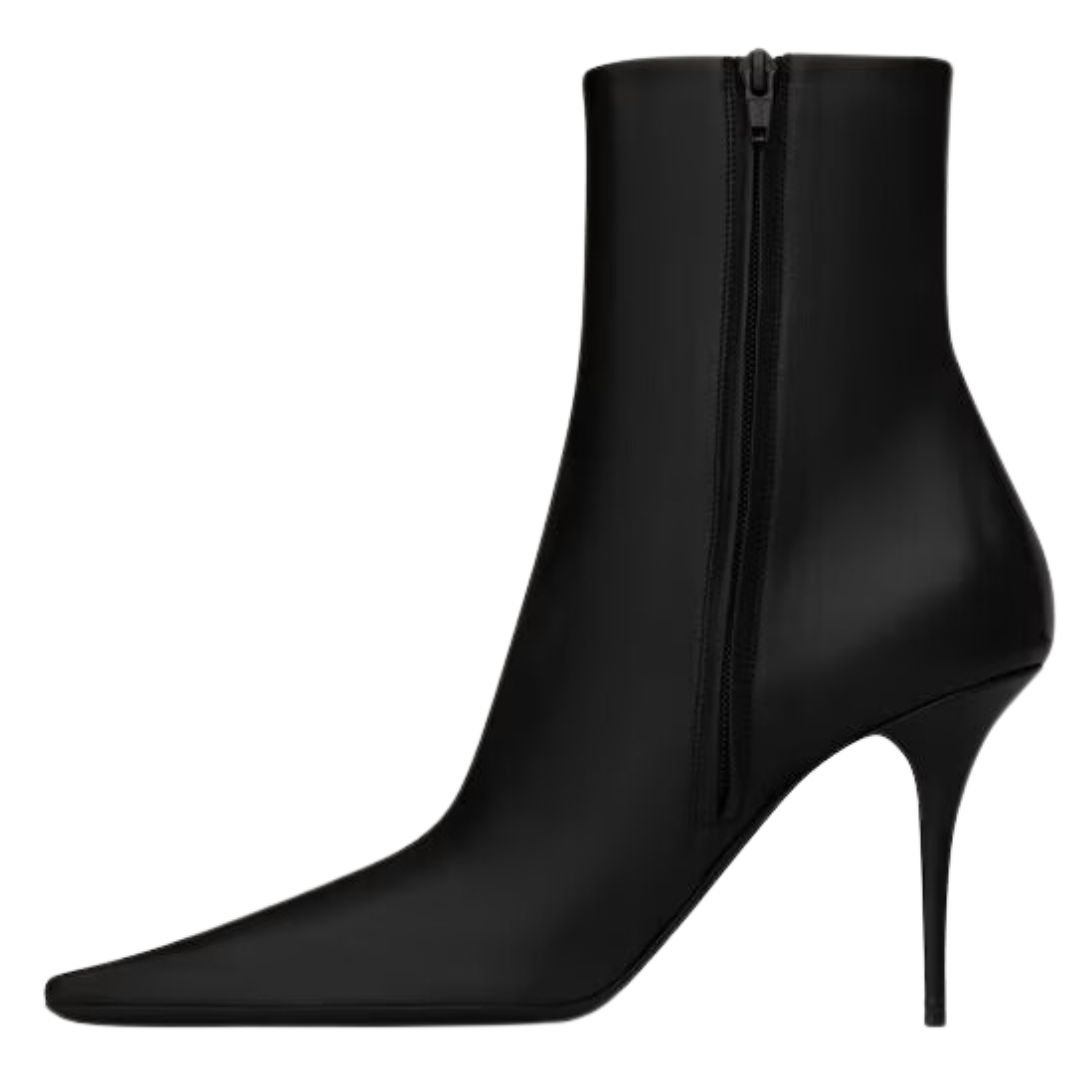 These ankle boots offer a sleek and refined silhouette with an elongated pointed toe and stiletto heel, creating a sophisticated and stylish look. The side zip closure ensures a secure fit and easy wear, while the leather sole adds durability and comfort.