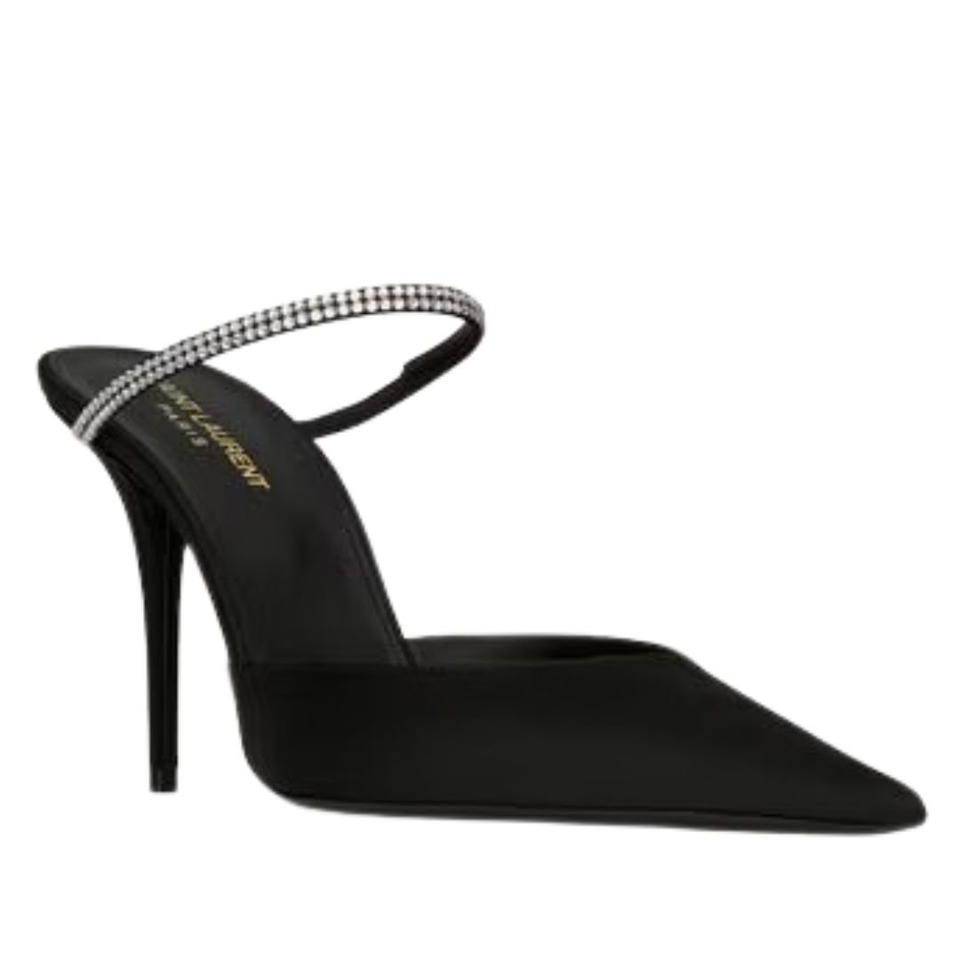 SAINT LAURENT BARBARA MULES IN SATIN CREPE AND RHINESTONES