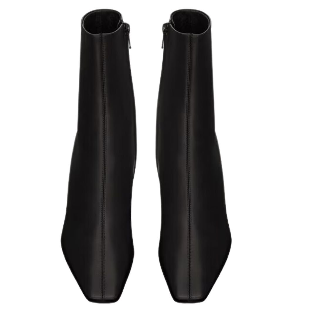 These ankle boots are a stylish combination of modern elegance and signature detailing. They feature a square pointed toe and a tapered block heel, providing both comfort and a fashionable silhouette. The boots are adorned with the iconic CASSANDRE logo in bronze-tone metal on the inner side, adding a distinctive touch of luxury.
