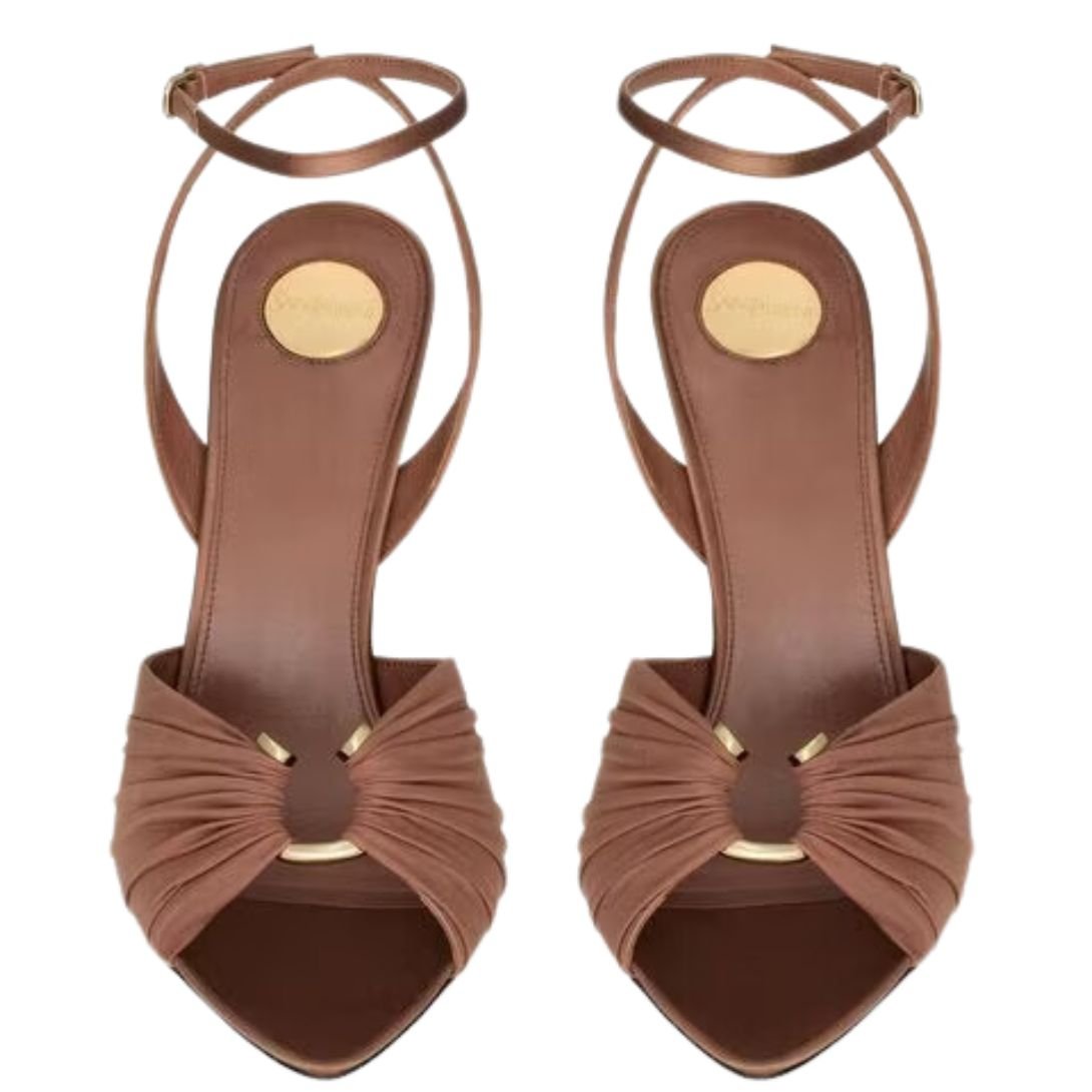 - Hand-draped hosiery upper is accentuated with a barbell piercing ornament, adding an edgy yet elegant touch.