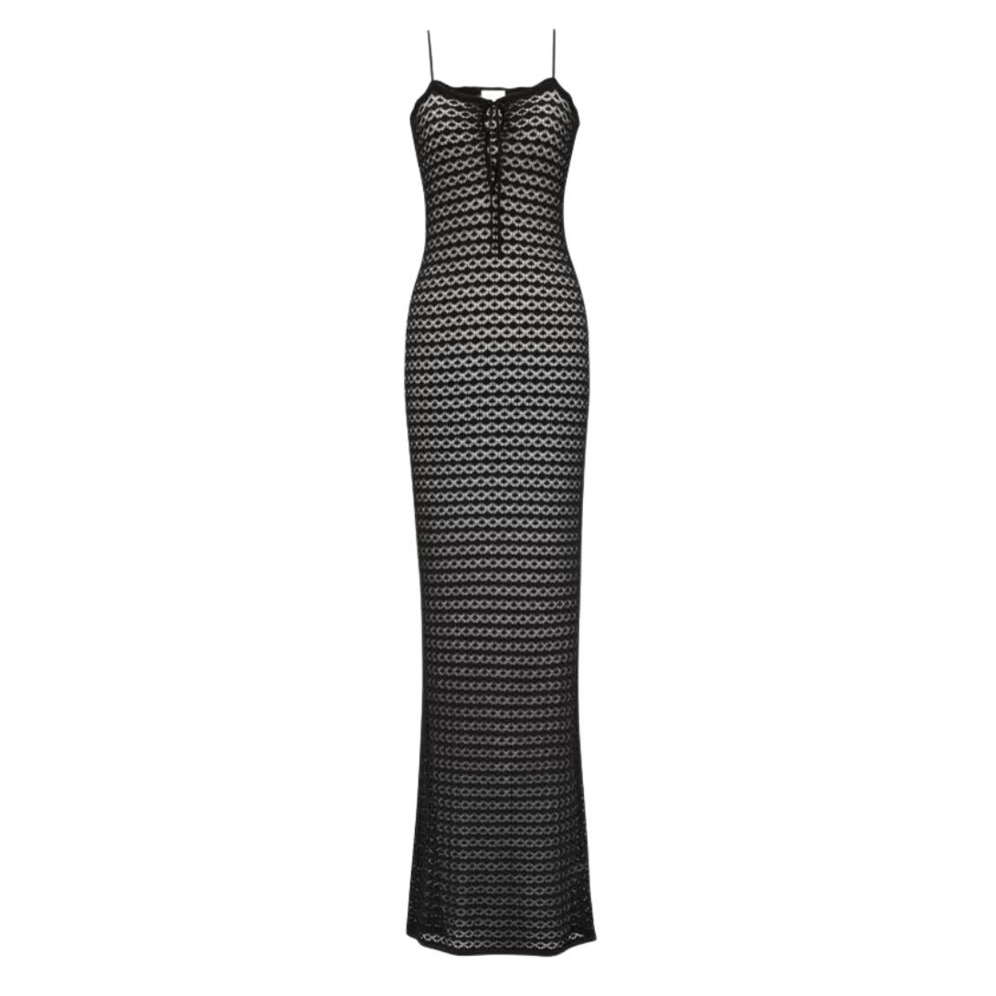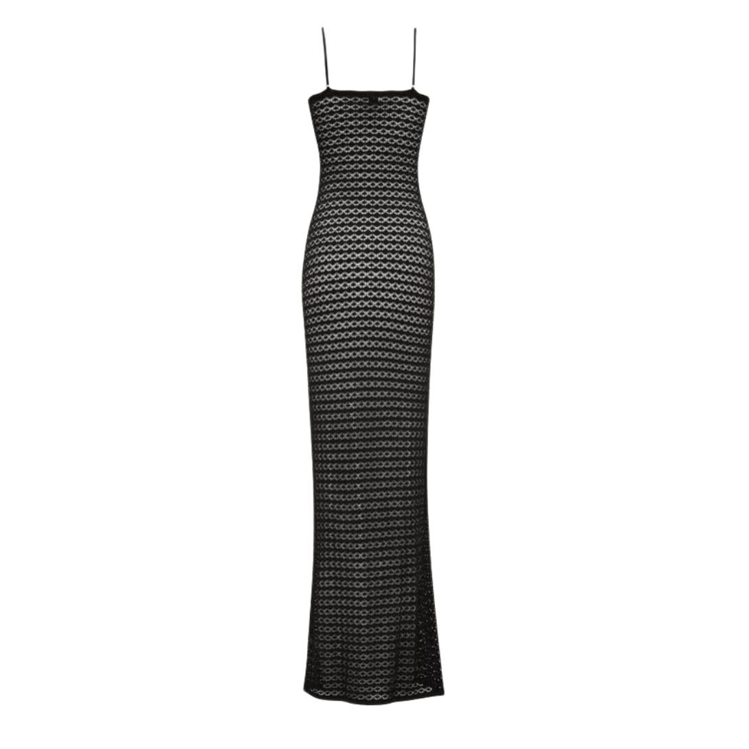 Made in Italy, this sheer maxi dress combines intricate knit detailing with modern design elements, offering a feminine and elegant piece that can be styled for both casual and more formal occasions.