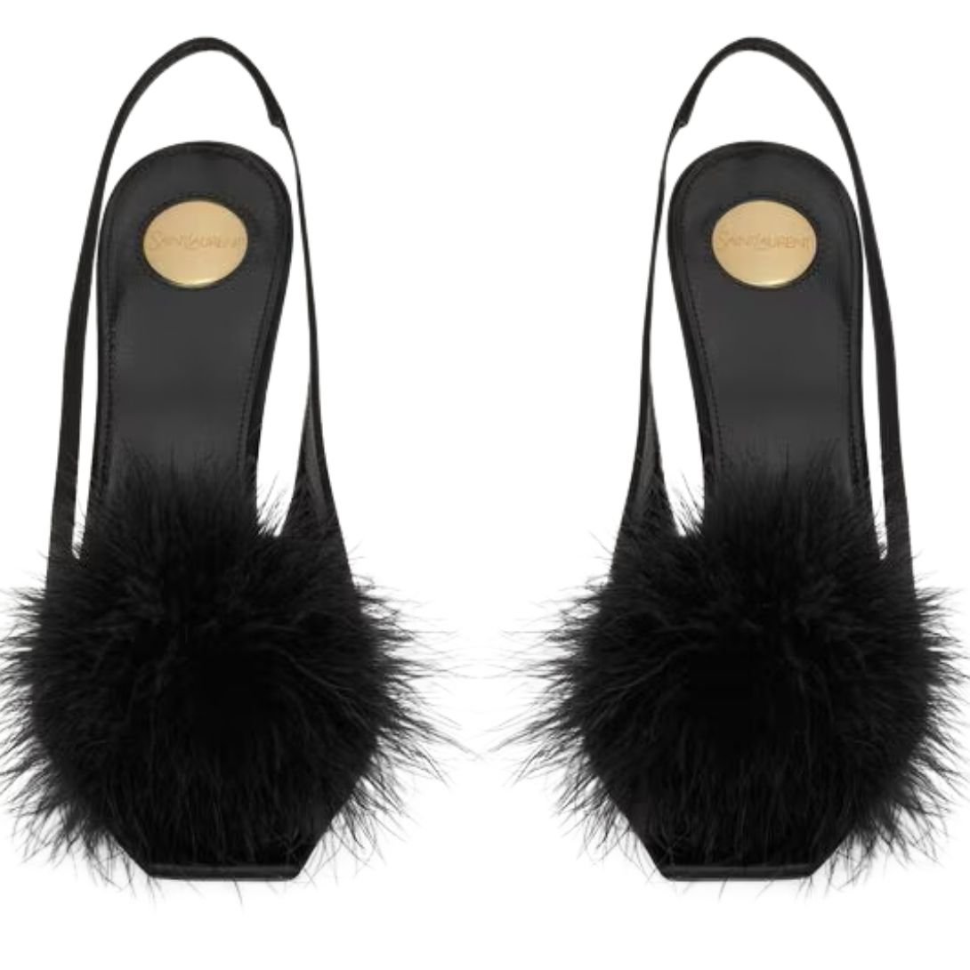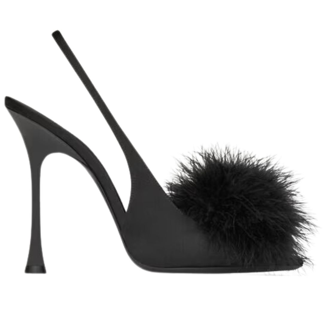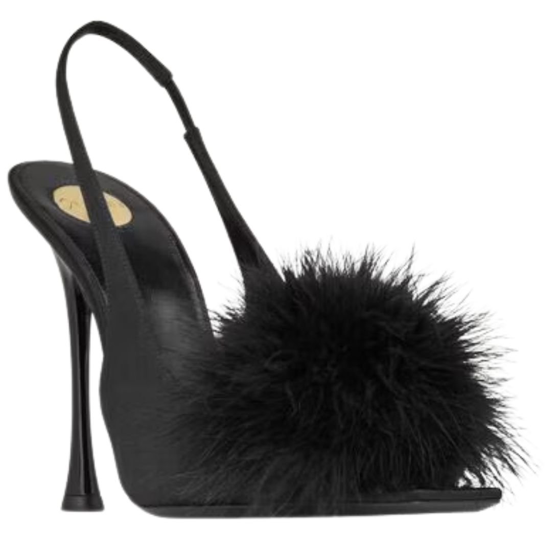 These slingback sandals offer a stylish and luxurious design, featuring a square toe adorned with a feather pompom and a flared stiletto heel. With an elasticized slingback strap, these sandals provide a secure and comfortable fit, making them a perfect choice for elegant occasions.