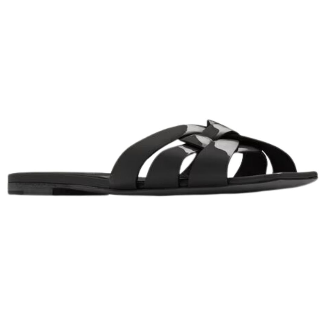 These slide sandals are crafted from glossy patent leather, featuring intertwining straps for a stylish and contemporary design. The minimalist silhouette makes them perfect for both casual and dressed-up occasions.