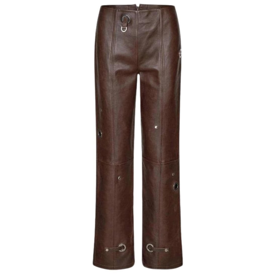 The Bonnie Pants include subtle, yet refined, detailing such as pressed creases running down the front of each leg, contributing to their polished and structured aesthetic. Two side pockets add practicality without compromising the streamlined design, providing space for essentials or simply enhancing the garment’s overall functionality. SAKS POTTS BONNIE PANTS CHESTNUT