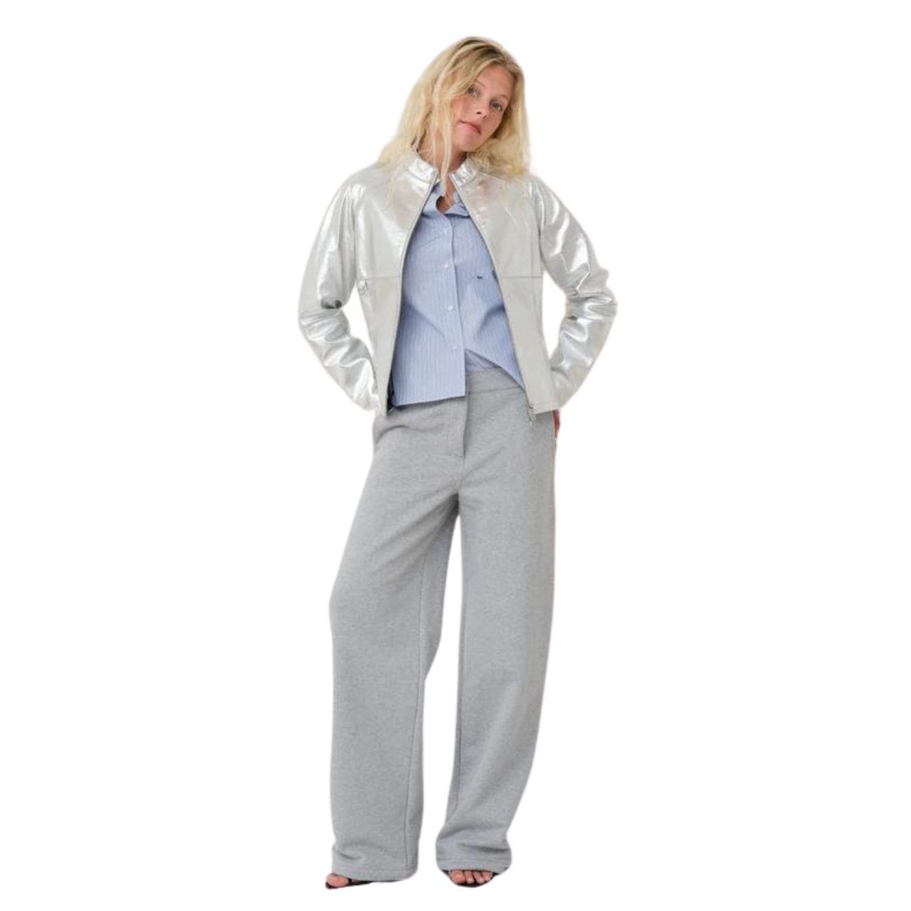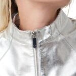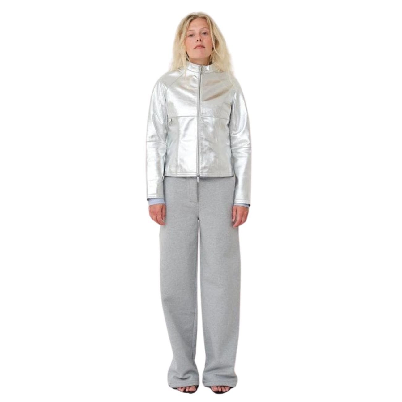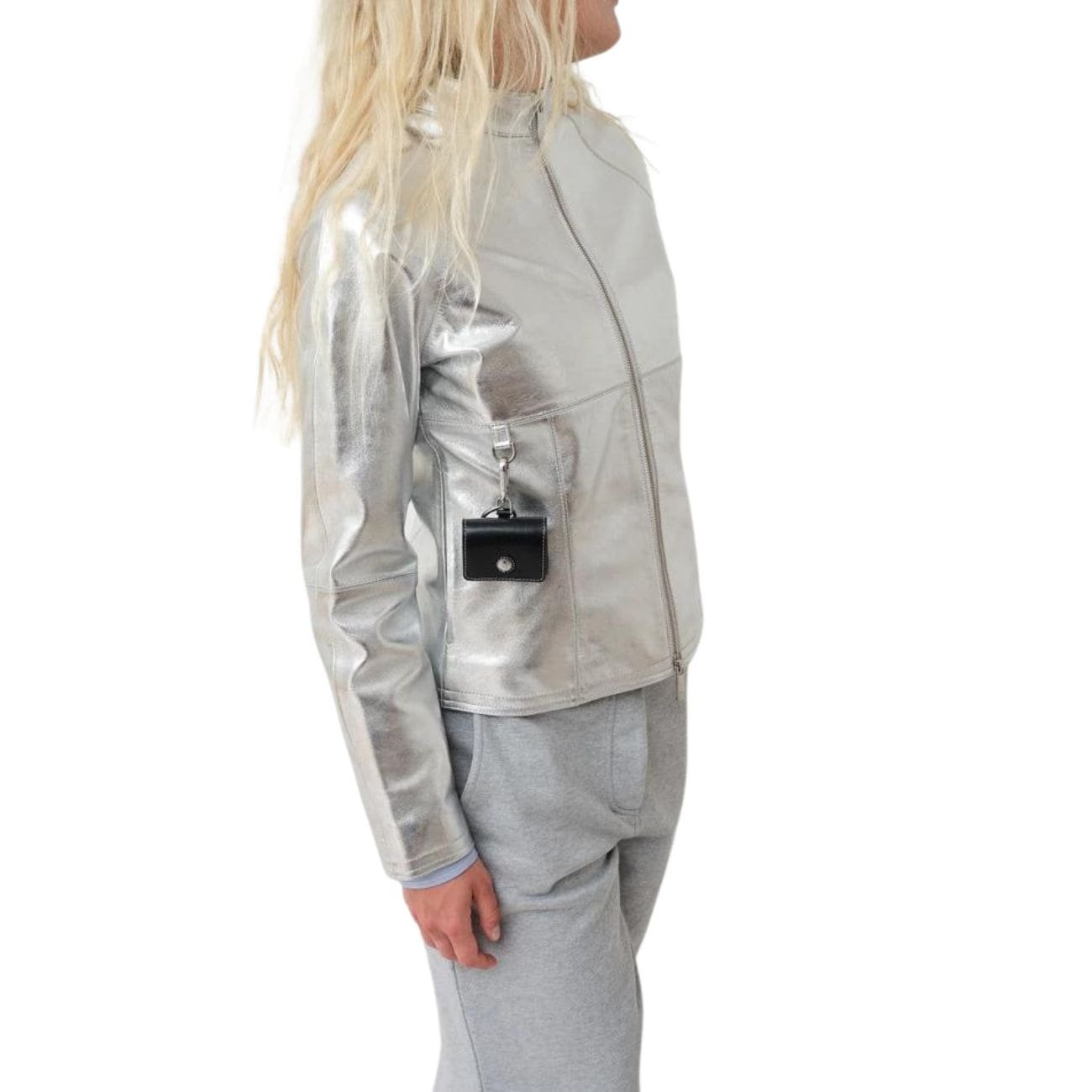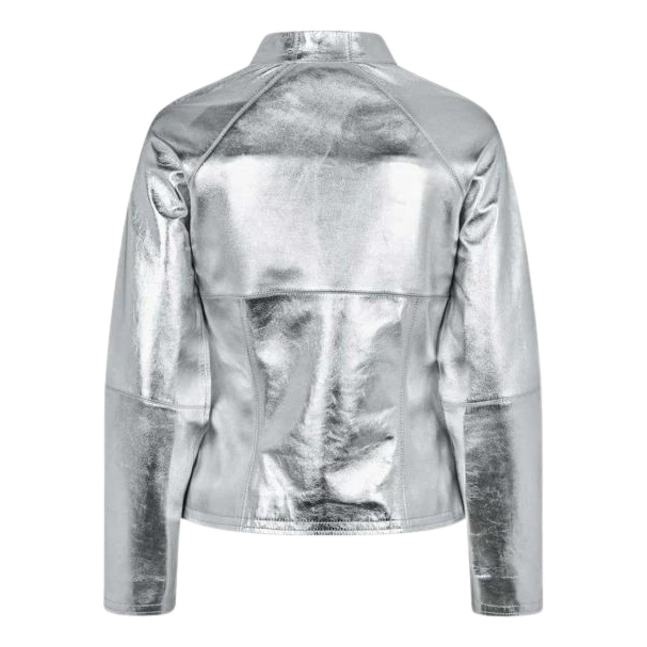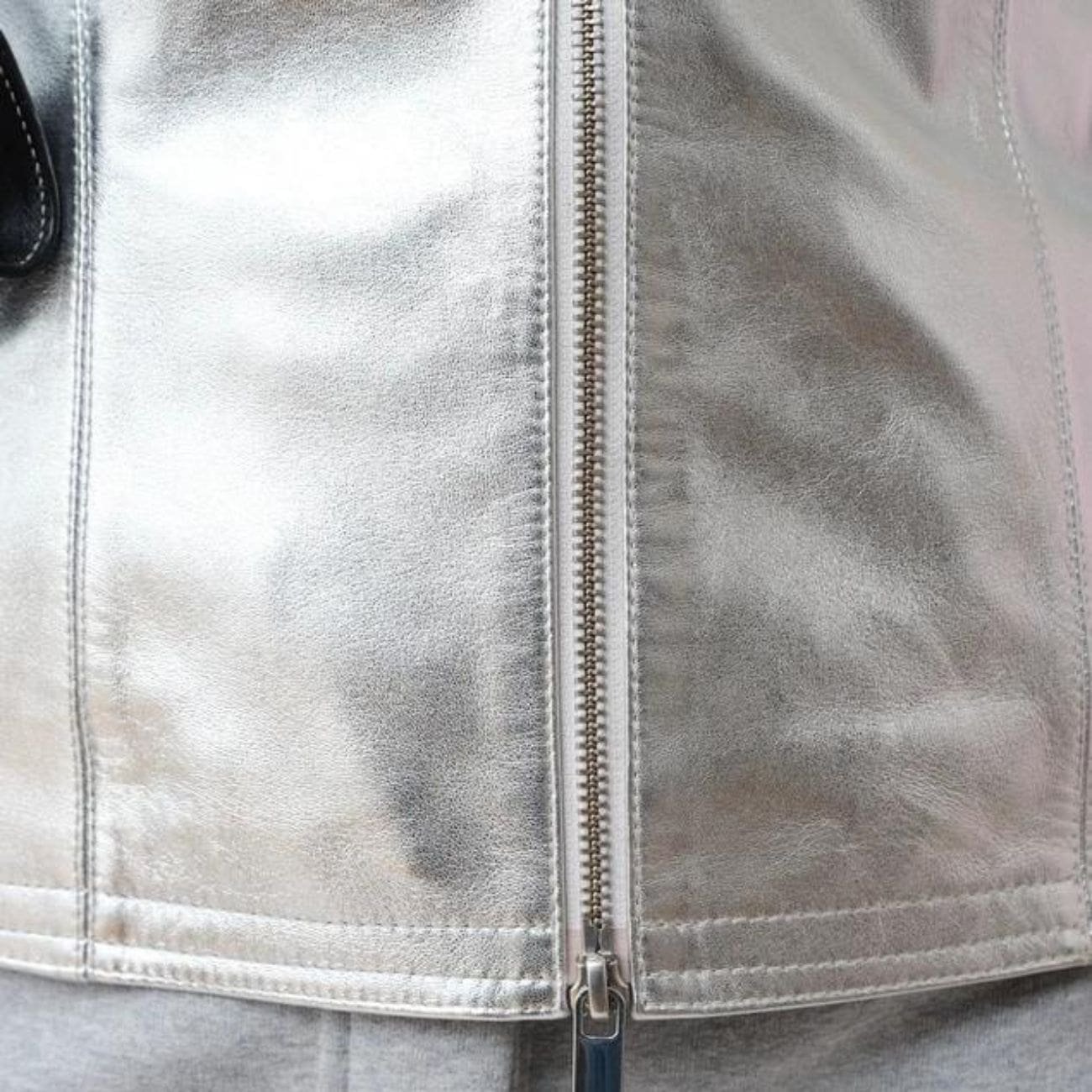 The Daria Jacket is characterized by its sleek and futuristic silver metallic finish, which gives it a modern and edgy appeal. The silver hue catches the light beautifully, adding a dynamic and eye-catching element to any outfit. The glossy surface is complemented by clean lines and a structured silhouette, creating a sophisticated yet daring look. SAKS POTTS DARIA JACKET SILVER