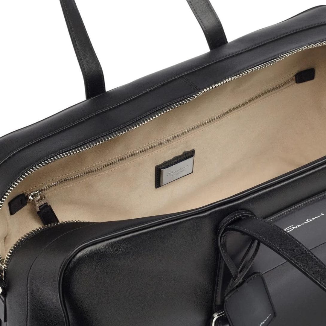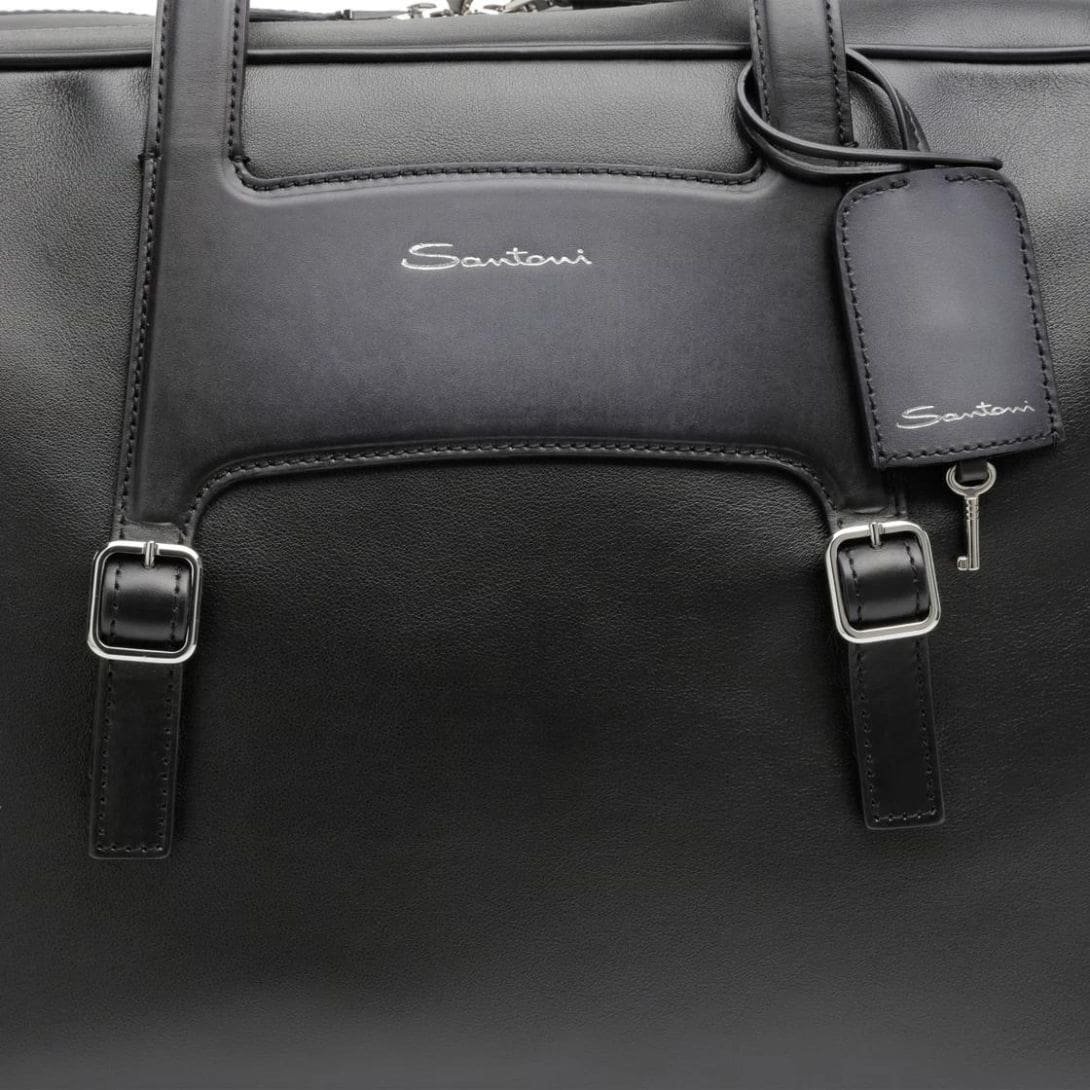 The exterior of the bag features a sleek, minimalist design, accented by subtle yet distinctive Santoni branding. The polished metal hardware complements the rich black leather, adding a touch of modernity without overshadowing the bag’s classic aesthetic. The sturdy leather handles are comfortable to grip, making it easy to carry by hand, while the detachable shoulder strap offers an alternative carrying option for added convenience.