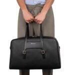 The Santoni Black Leather Weekend Bag is the epitome of luxurious travel gear, designed for the discerning traveler who values both style and functionality. Crafted from premium black leather, this bag exudes sophistication and timeless elegance. The smooth, supple leather not only adds a touch of class but also ensures durability, making it a reliable companion for many journeys to come.
