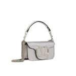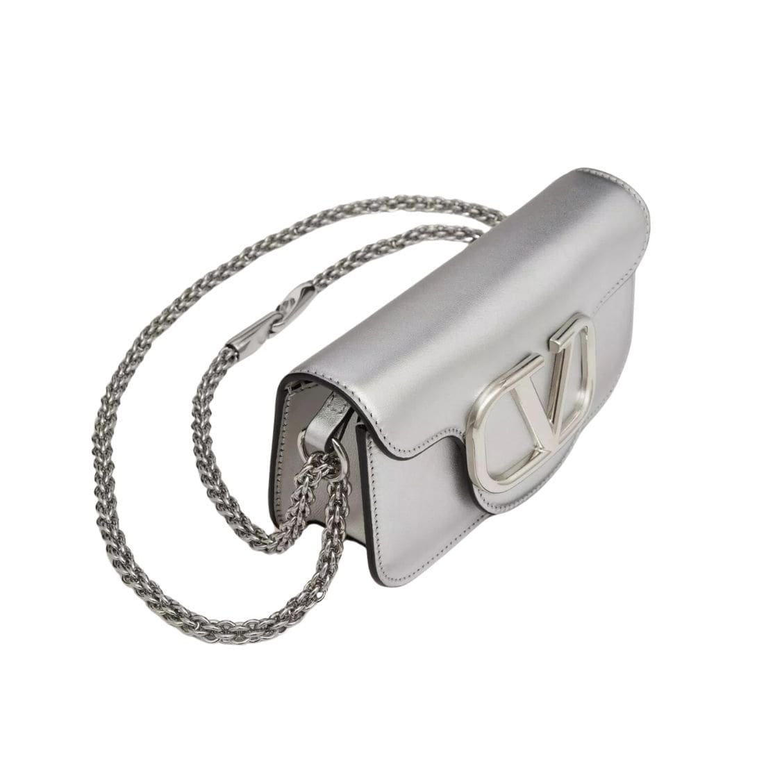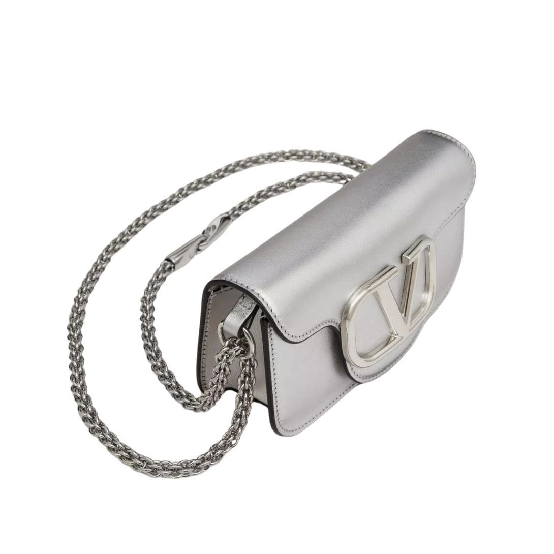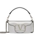 Introducing the small loco metallic calfskin shoulder bag, crafted from metallic calfskin leather and adorned with a striking metallic VLogo Signature detail. This versatile accessory offers both a detachable sliding chain strap and a detachable handle, allowing it to effortlessly transition between a crossbody, shoulder bag, or handbag.