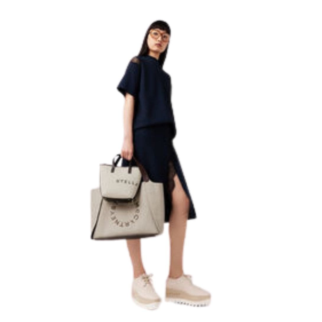 Our Stella Mccartney Logo crossbody Bag is designed for tougher, everyday wear, a vegan alternative to animal leather. This top-handled tote features our signature circular logo perforated on the front and includes a practical, buttoned pouch inside for easy organization.
