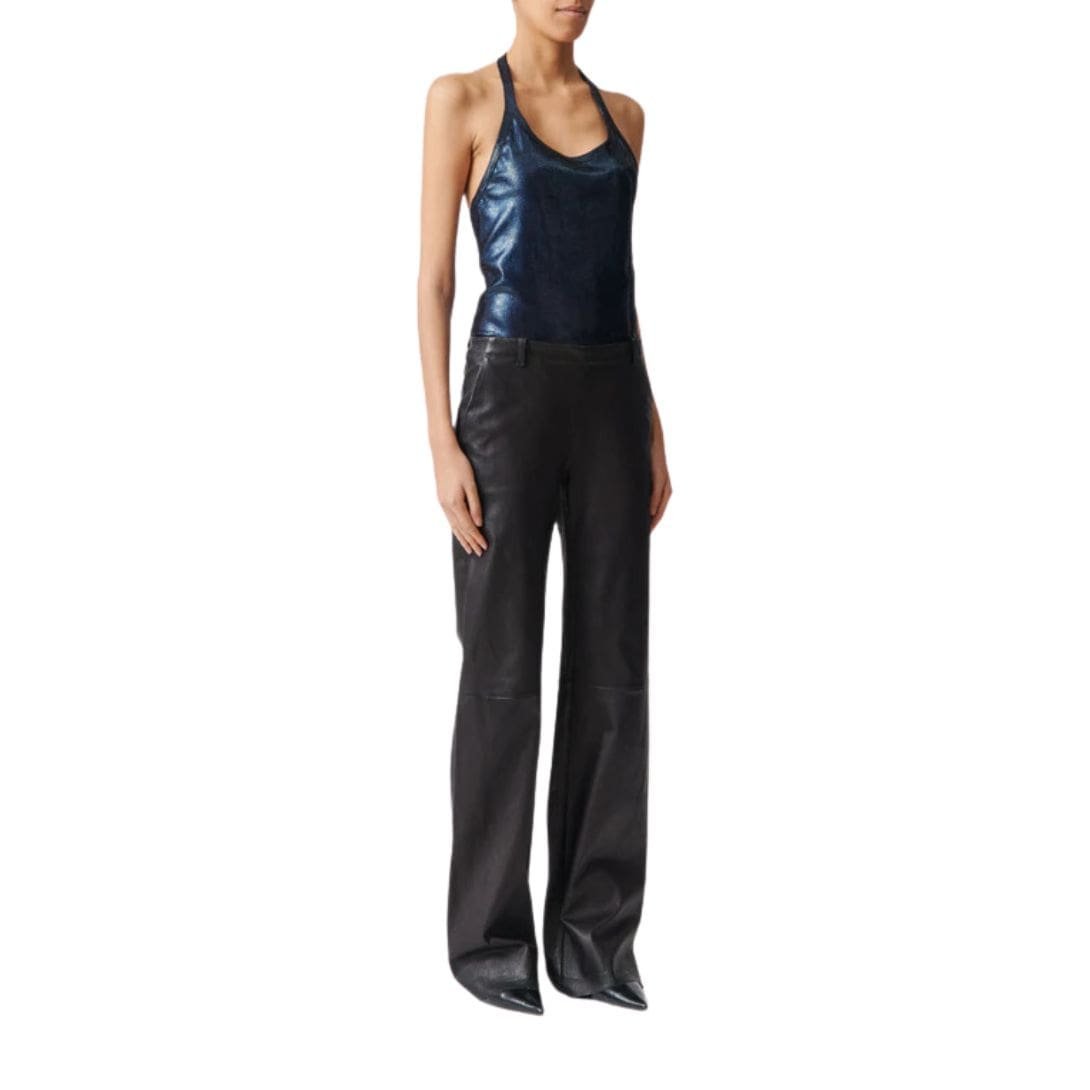 Introducing the STOULS Oswald Wide Flared Leather Pants, a stunning fusion of retro elegance and modern sophistication. Expertly crafted from premium lambskin leather, these pants feature a high-rise waist and an exaggerated wide flared leg, creating a bold and flattering silhouette. The buttery-soft texture and impeccable fit ensure unparalleled comfort and style, making them an ideal choice for both casual outings and upscale events. With their timeless appeal and versatile design, the STOULS Oswald Wide Flared Leather Pants are a must-have addition to any fashion-forward wardrobe.