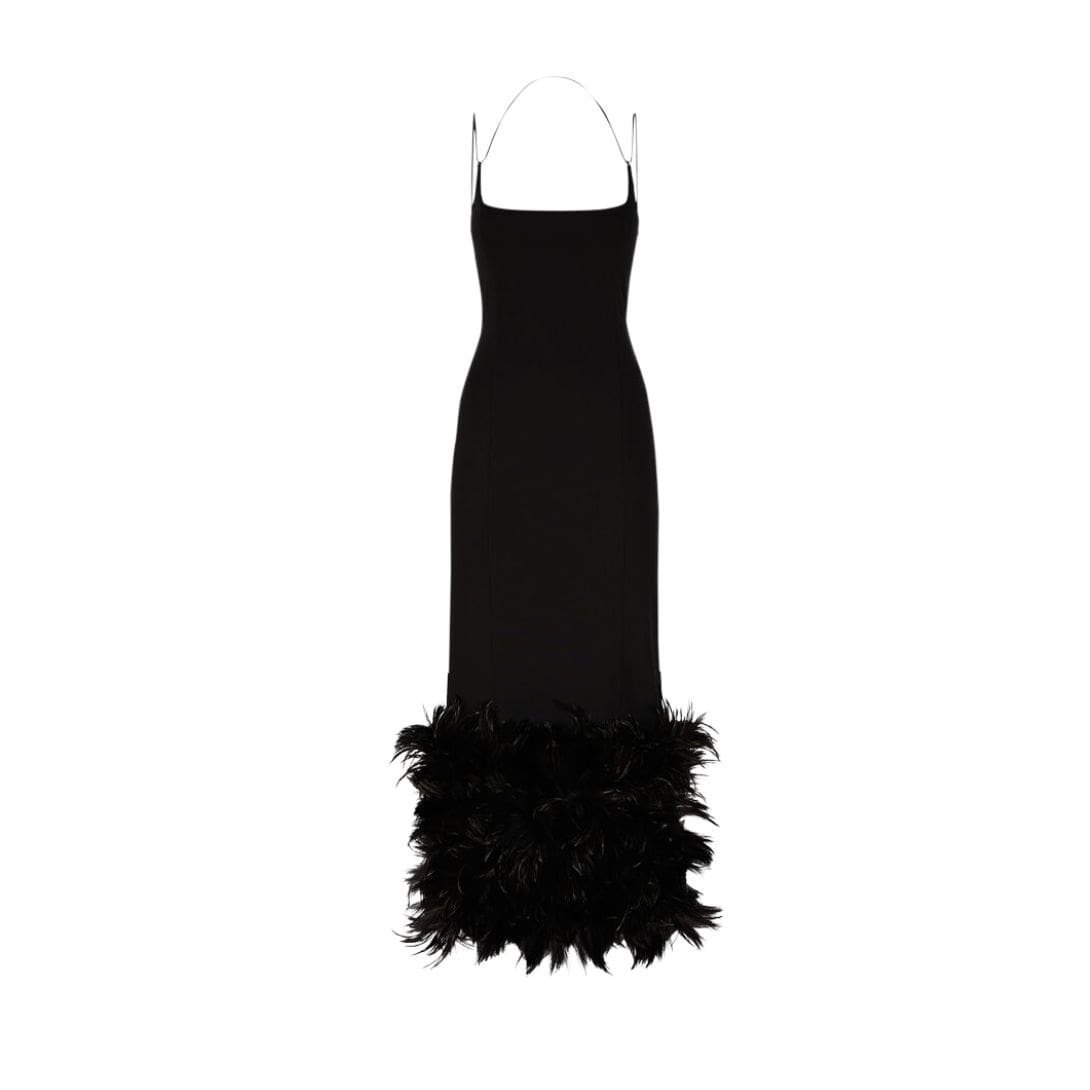 The Attico Black Midi Dress in black compact techno jersey with ostrich boa feathers along the bottom, double straps, and logo metal adjusters. Made in Italy.