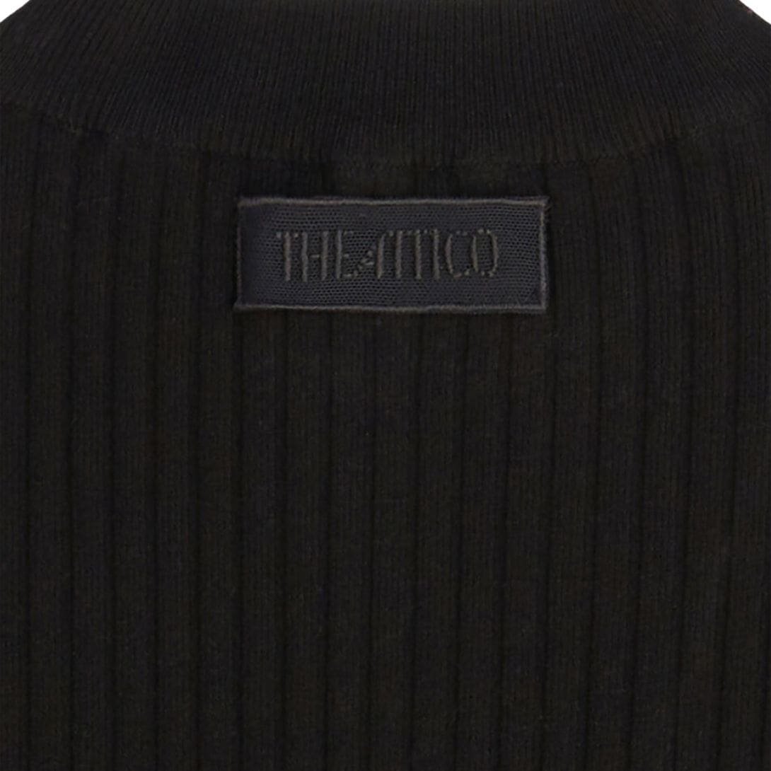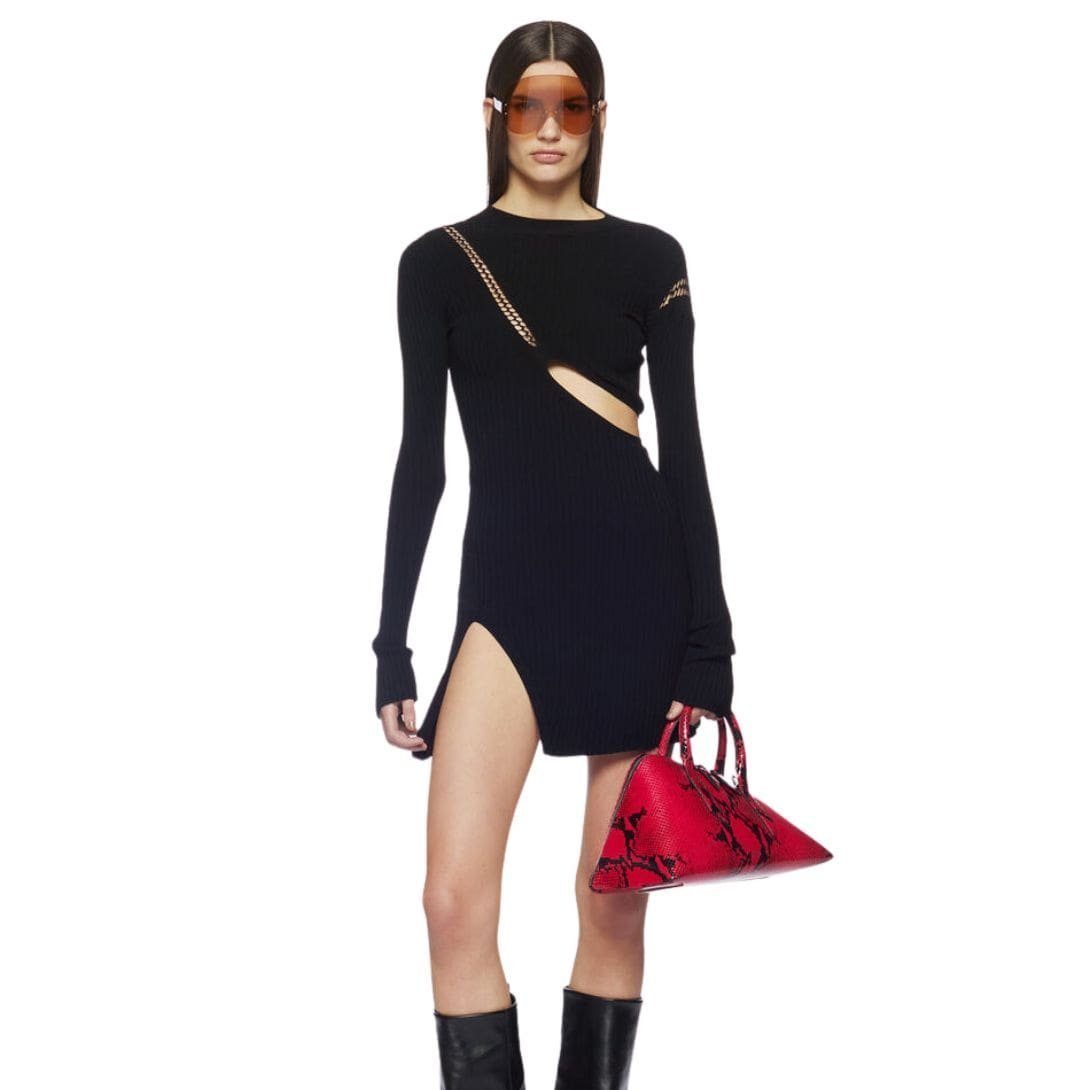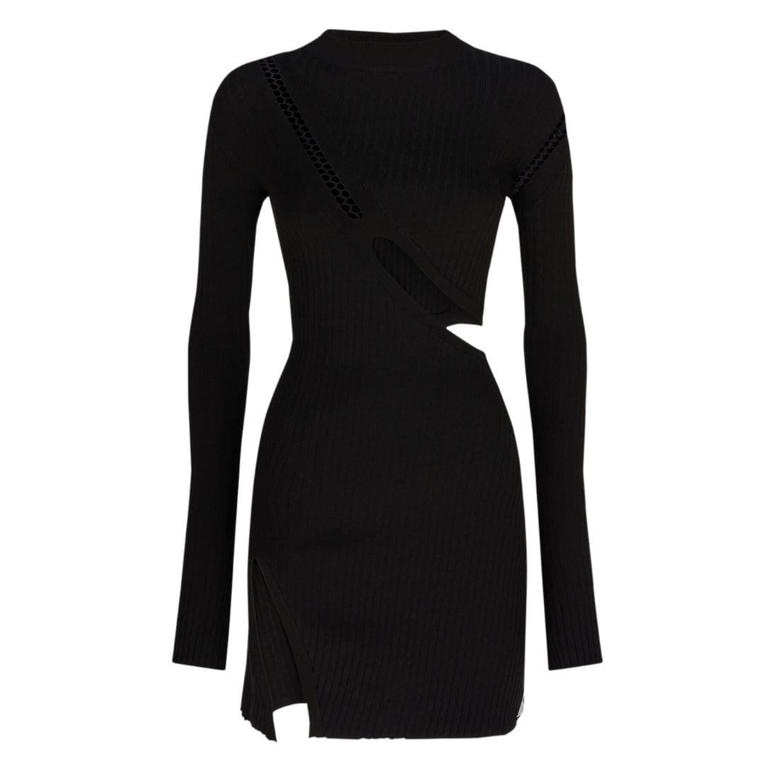 The Attico Black Mini Dress in black stretch viscose with oblique cuts and an embroidered logo label. Made in Italy.
