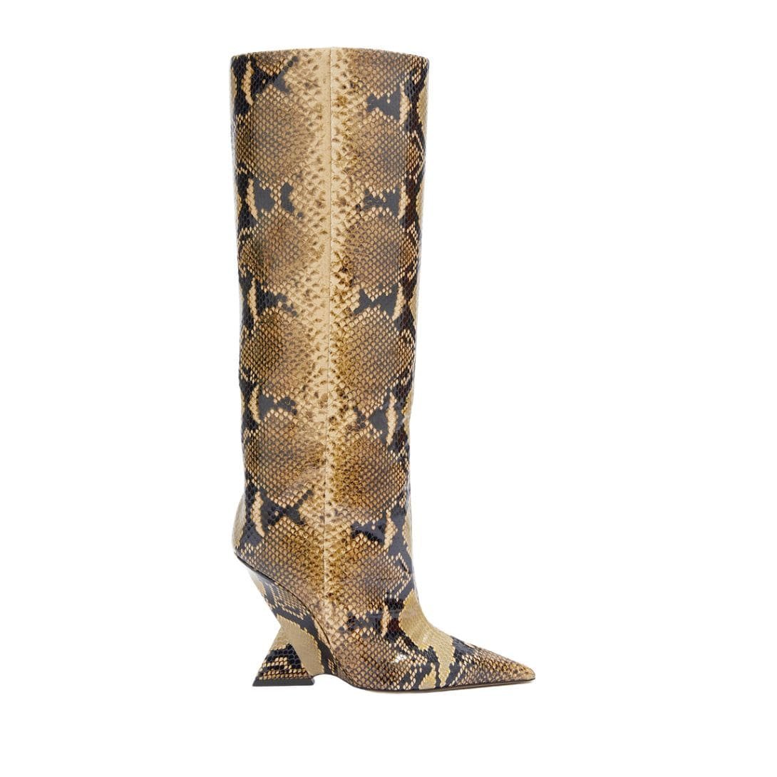 The Attico ”cheope” Sand and Black Tube Boot python-printed leather with a pyramid wedge, 105mm heel. Made in Italy.