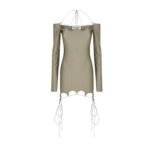 The Attico “Lyna” Military Mini Dress in military shiny lycra with scalloped neckline and hem, adorned with cylindrical logo metal ends.