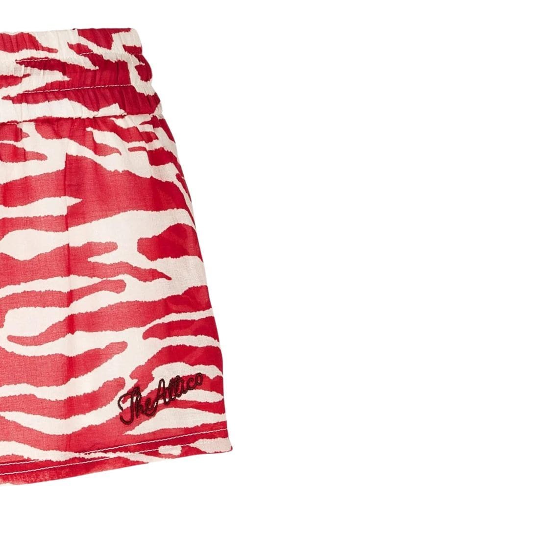 The Attico Red and Milk Short Pants are adorned with a striking red and milk zebra print and feature side pockets, a drawstring waist with logo metal ends, and an embroidered logo. Made in Italy.