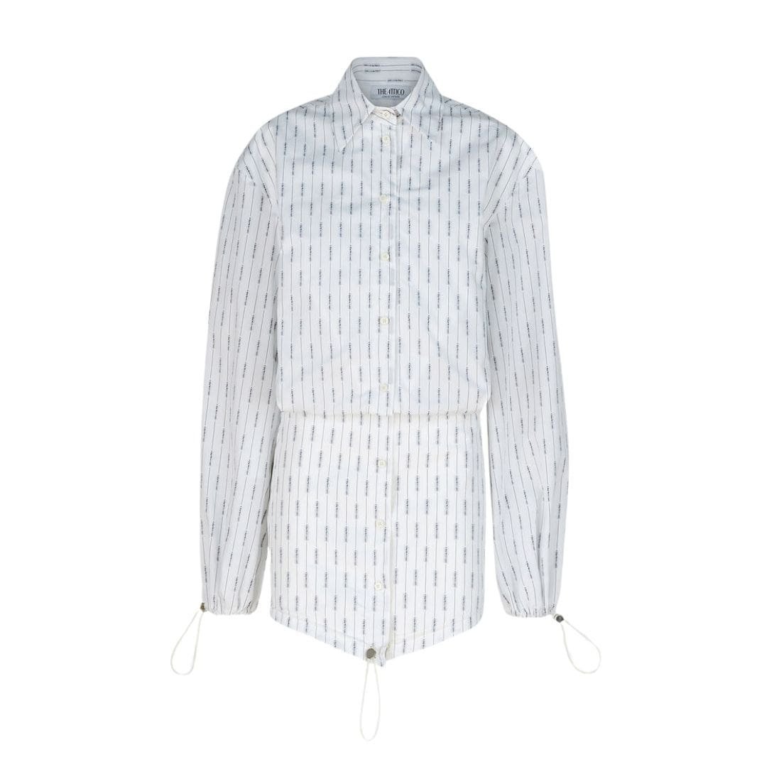 The Attico White and Black Mini Dress in white and black striped logo cotton jacquard with a fitted basque, drawstring detail, and logo metal stops. Made in Italy.