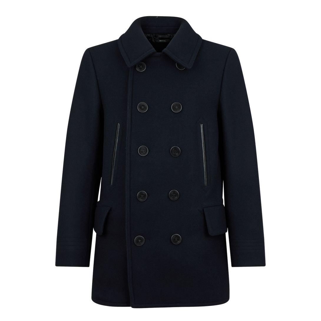 Featuring upper zip pockets and lower flap pockets, this peacoat balances practicality with elegant design. The upper pockets with leather piping detail add a luxurious finish.