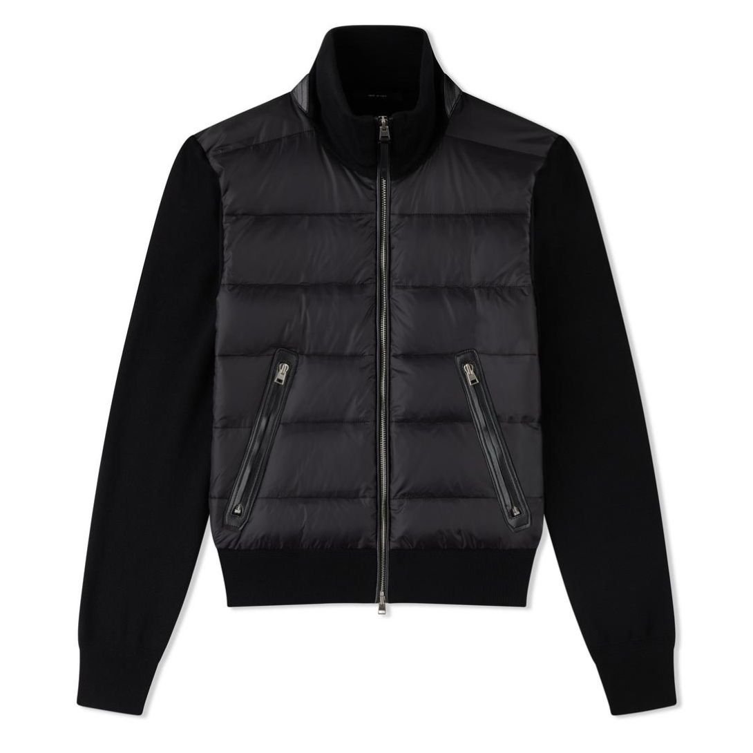 - Knitted rib merino with nylon down front, combining texture and insulation.