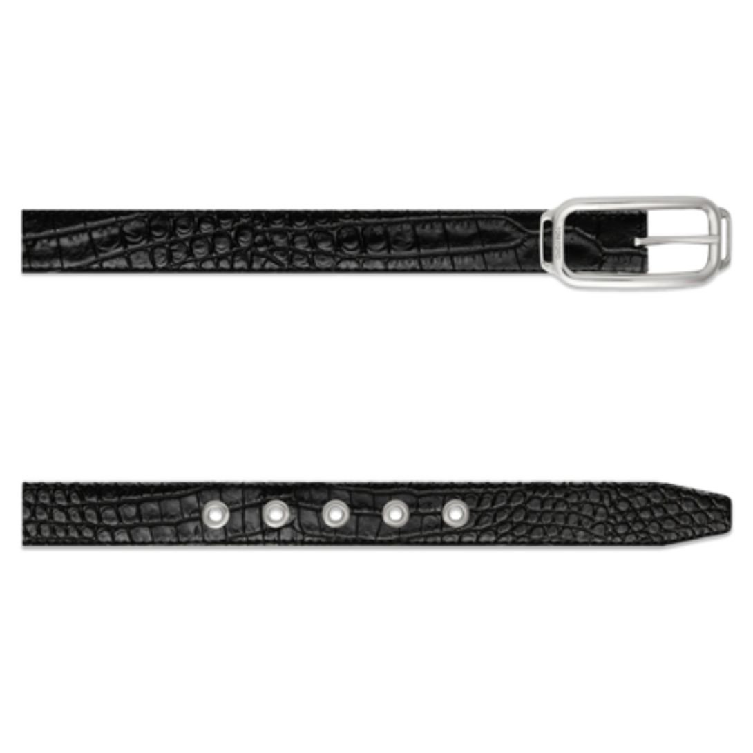 The 100% brass hardware is finished with palladium galvanization, offering a sleek, silver-toned shine. This premium finish not only enhances the belt’s sophisticated look but also ensures resistance to tarnishing and wear.