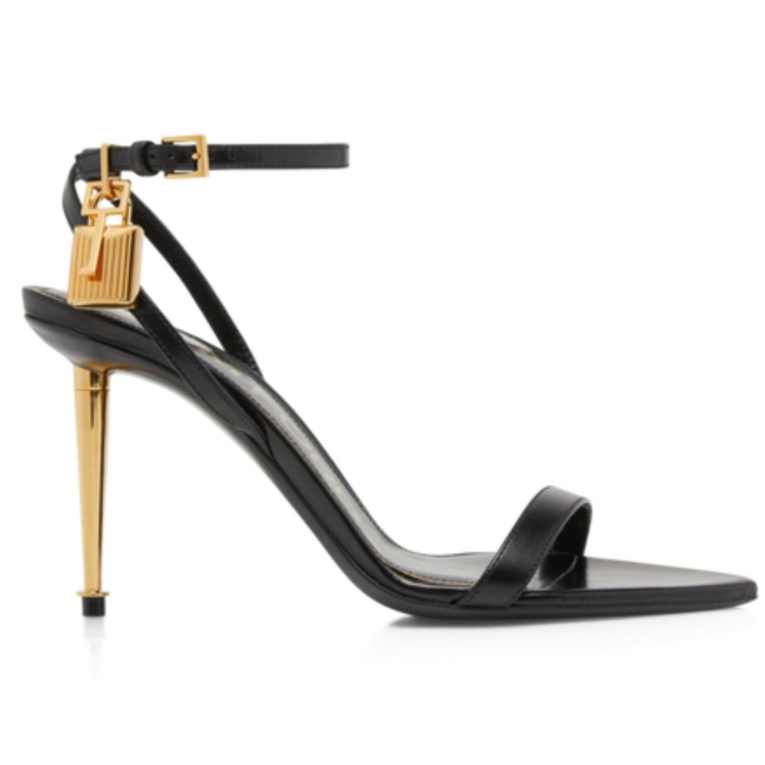 TOM FORD LAMINATED NAPPA LEATHER PADLOCK POINTY NAKED SANDAL 85MM GOLD