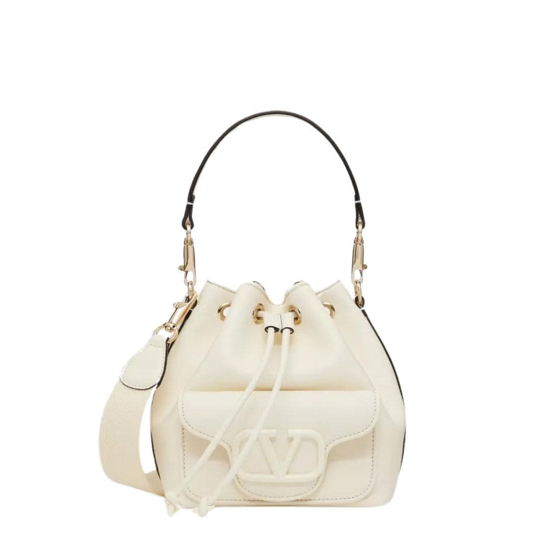Elevate your accessory game with the Valentino Garavani Locò Calfskin Leather Bucket Bag, a timeless essential that epitomizes luxury and refinement.
