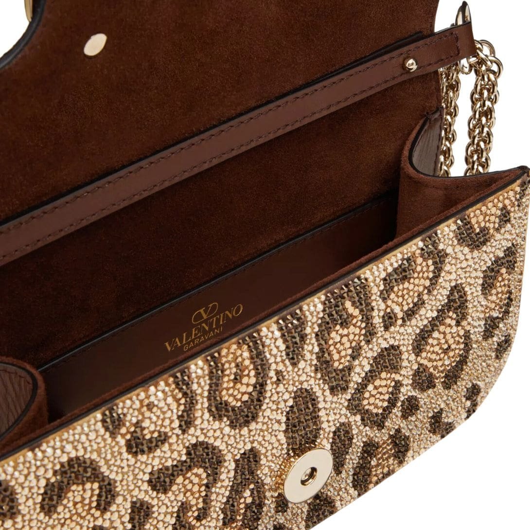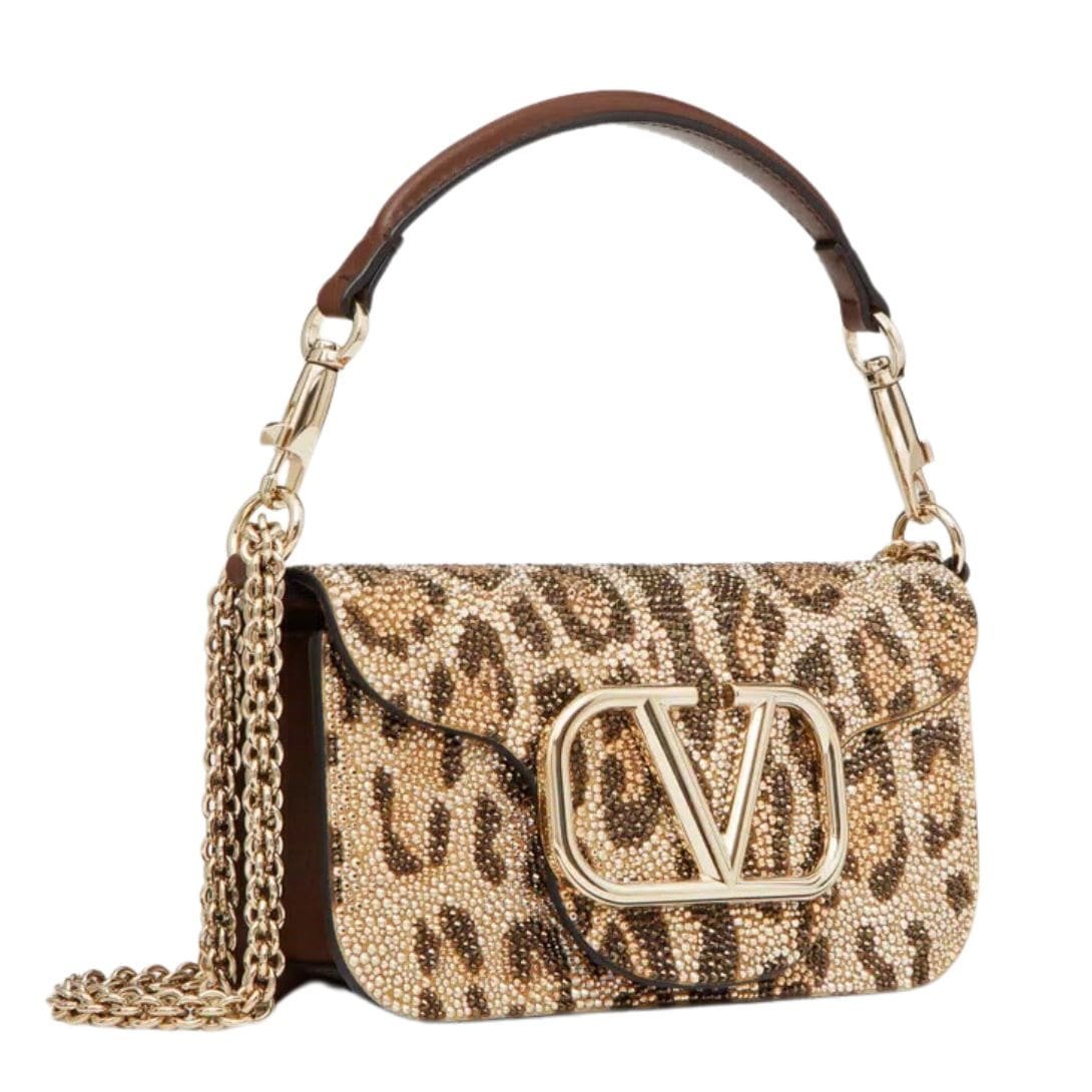 The Valentino Garavani Locò small shoulder bag boasts a captivating Animalier pattern rhinestone appliqué, paired with the iconic VLogo Signature metallic element, epitomizing luxurious sophistication.