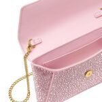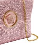 The clutch’s exterior is adorned with the unmistakable emblem of Versace’s Medusa head, intricately embellished with dazzling crystals that catch and reflect light, casting a spellbinding aura wherever it goes. The shimmering crystals create a mesmerizing play of light, adding an extra dimension of luxury to the accessory.