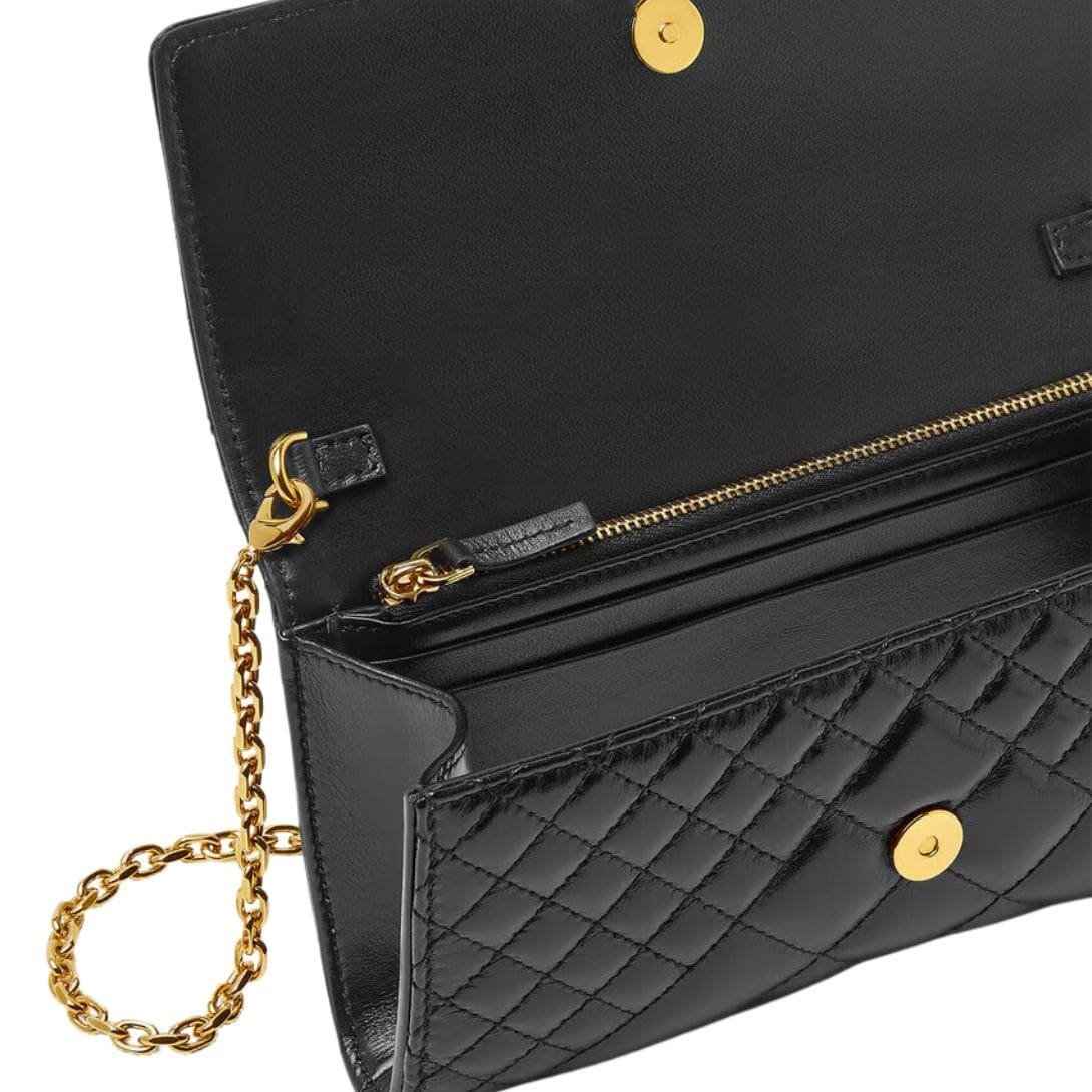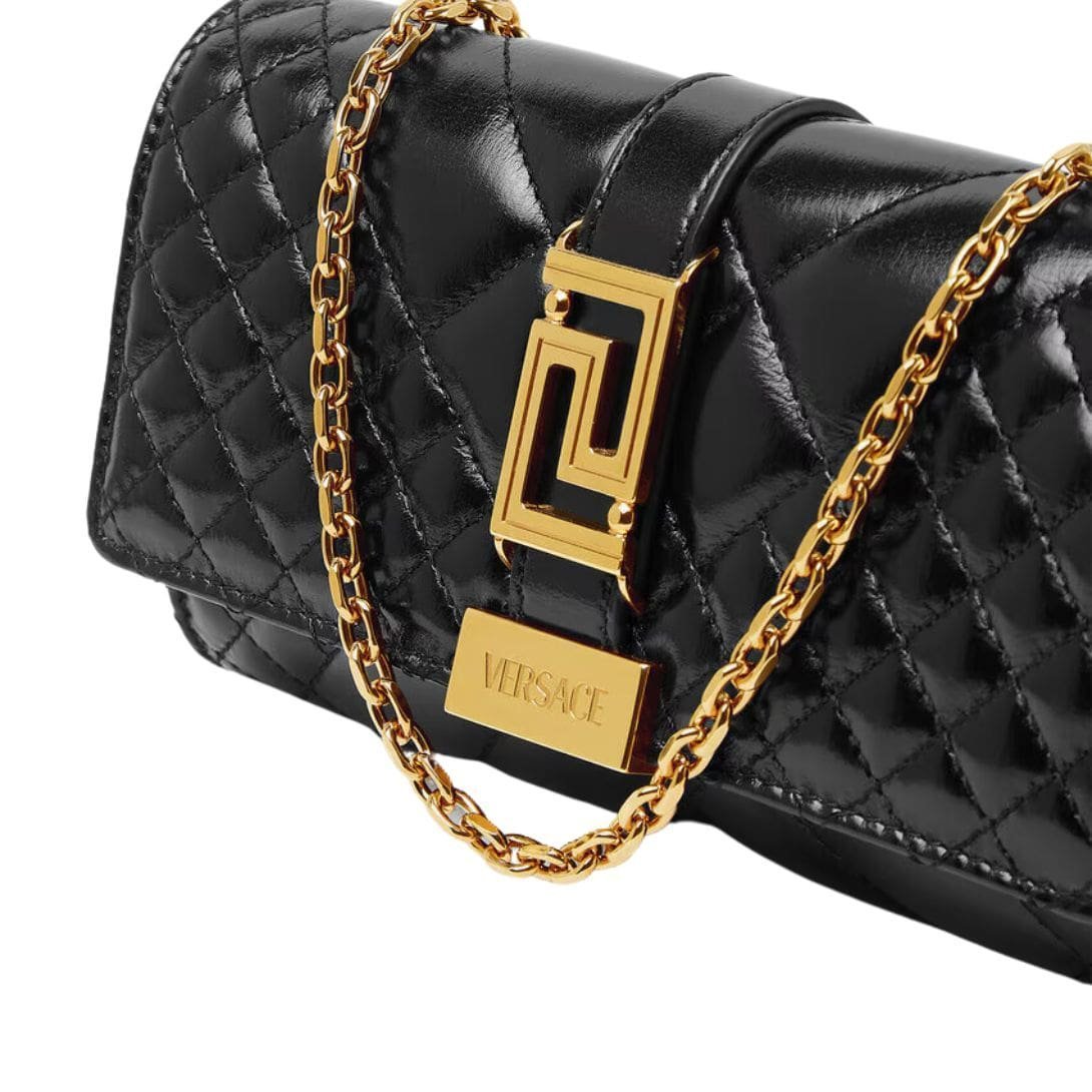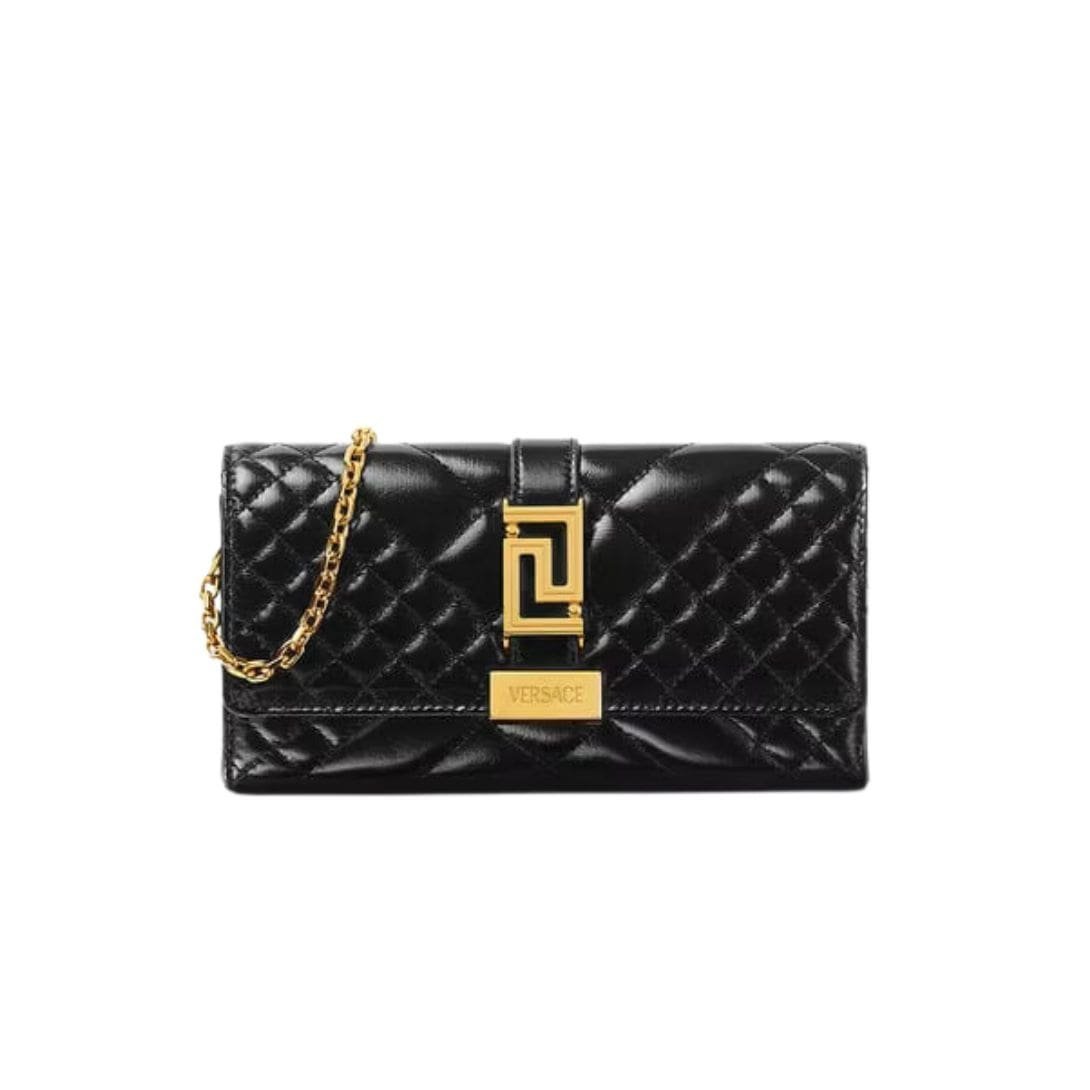 The centerpiece of the Greca Goddess Clutch is the iconic Medusa head emblem, a signature of Versace’s design language. This emblem is often rendered in gleaming gold-tone metal, providing a striking contrast against the leather backdrop and adding a hint of regal glamour. The Medusa motif is not just a decorative element but a symbol of power, allure, and mystery, perfectly encapsulating the Versace aesthetic.