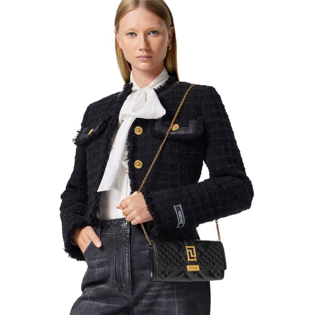 The Versace Greca Goddess Clutch bag is versatile enough to complement a variety of outfits, from formal evening wear to chic casual ensembles. Its blend of classical influences and contemporary design makes it a timeless accessory that transcends seasonal trends, promising to be a treasured piece in any wardrobe. Whether carried as a clutch or with an optional chain strap, it epitomizes the luxury and sophistication of Versace.