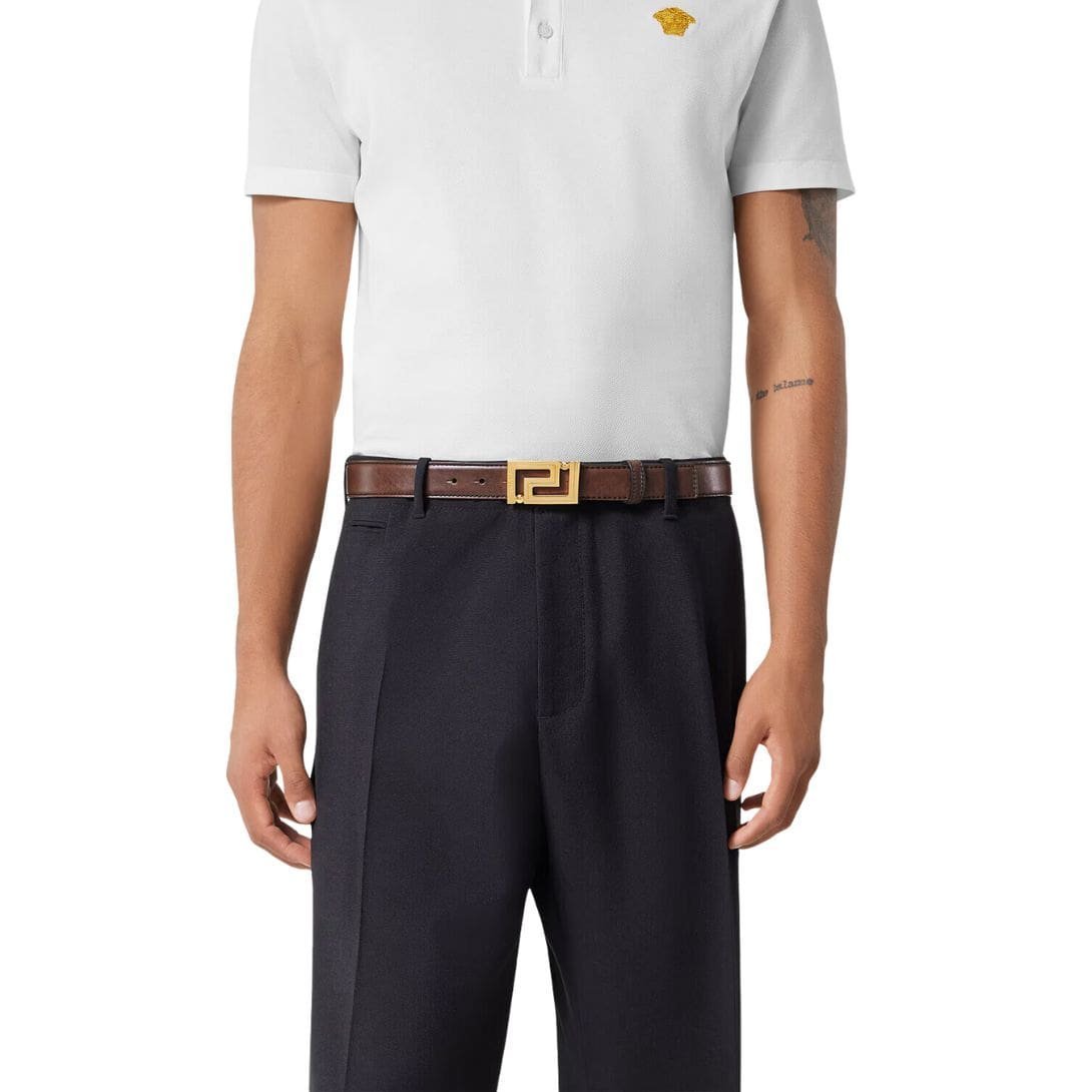 Versatility is a hallmark of this accessory, effortlessly complementing a myriad of ensembles, from tailored suits to casual denim. Whether worn to cinch the waist of a sleek evening gown or to add a touch of sophistication to everyday attire, the Versace Greca Leather Belt elevates any look with its understated yet unmistakable allure.