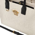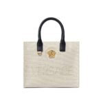 The Versace La Medusa Canvas Small Tote Bag epitomizes the brand’s opulent aesthetic and timeless elegance. Crafted with meticulous attention to detail, this iconic accessory seamlessly blends luxury with functionality.