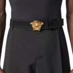 The belt’s design is further accentuated by the intricate Greca pattern, another hallmark of Versace’s aesthetic. Inspired by classic Greek motifs, the Greca pattern symbolizes unity, strength, and eternal beauty. Its symmetrical geometric design adds a sense of harmony and balance to the belt, elevating its overall appeal.