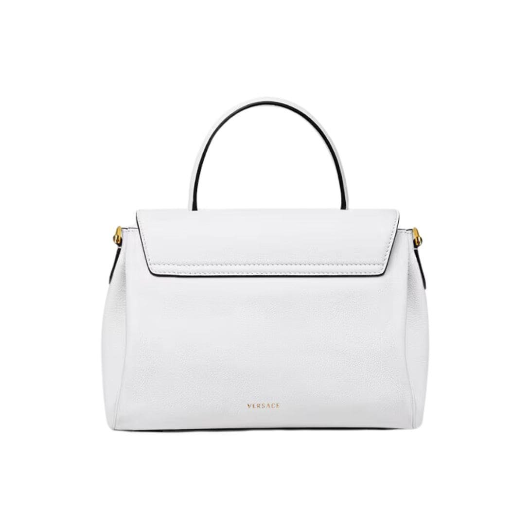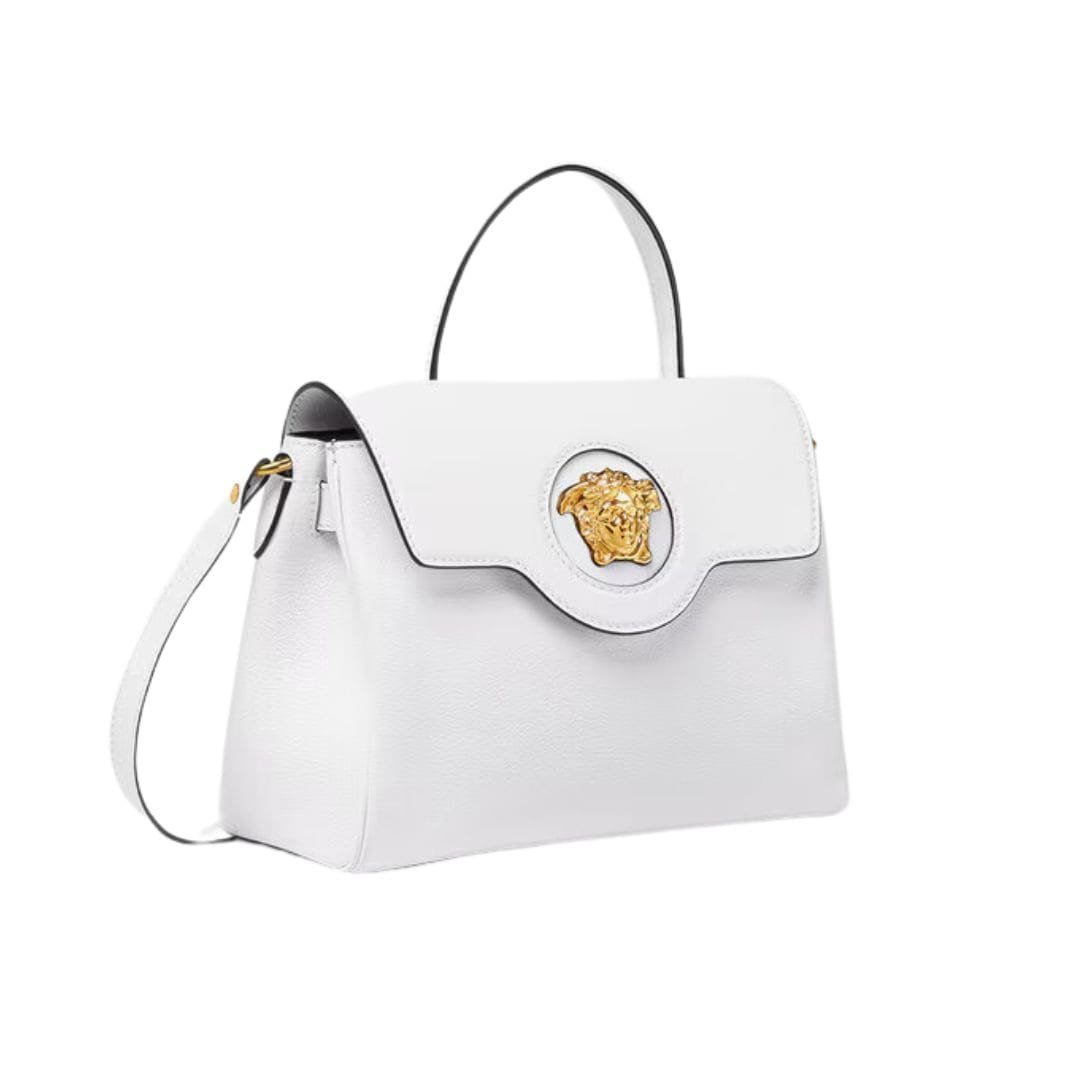 At first glance, the handbag captivates with its striking design featuring the iconic Versace Medusa emblem as the centerpiece. The golden emblem, intricately embellished with delicate details, exudes a sense of power and allure, serving as the focal point that commands attention. It is meticulously crafted from high-quality materials, ensuring durability and longevity while maintaining its exquisite allure.