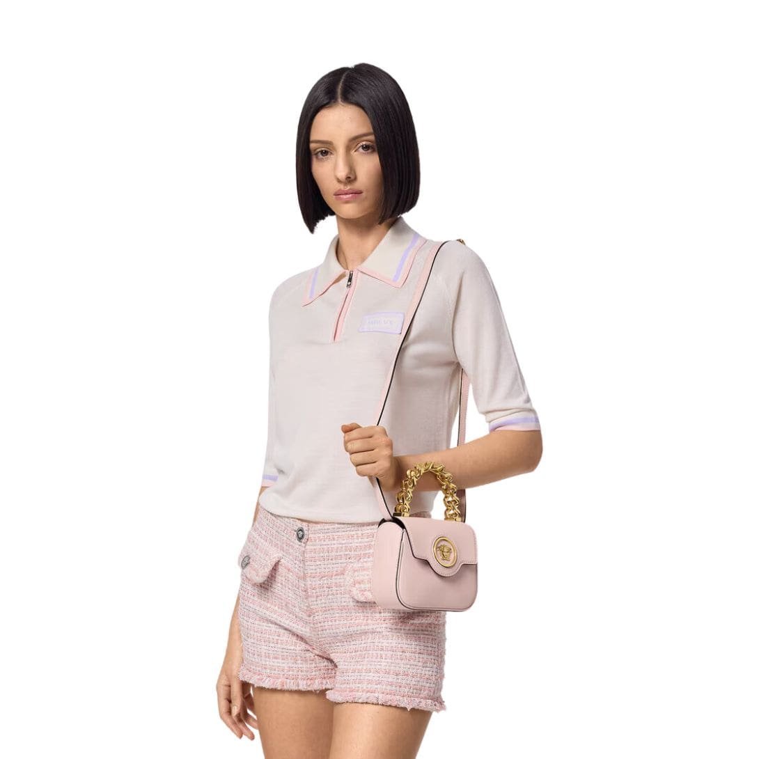Measuring perfectly petite yet boasting remarkable functionality, the La Medusa Mini Bag is designed to accompany the modern woman on her daily endeavors with grace and style. Its structured silhouette exudes refinement, while the iconic Medusa emblem, intricately embellished on the front flap, serves as a symbol of power, allure, and allure.
