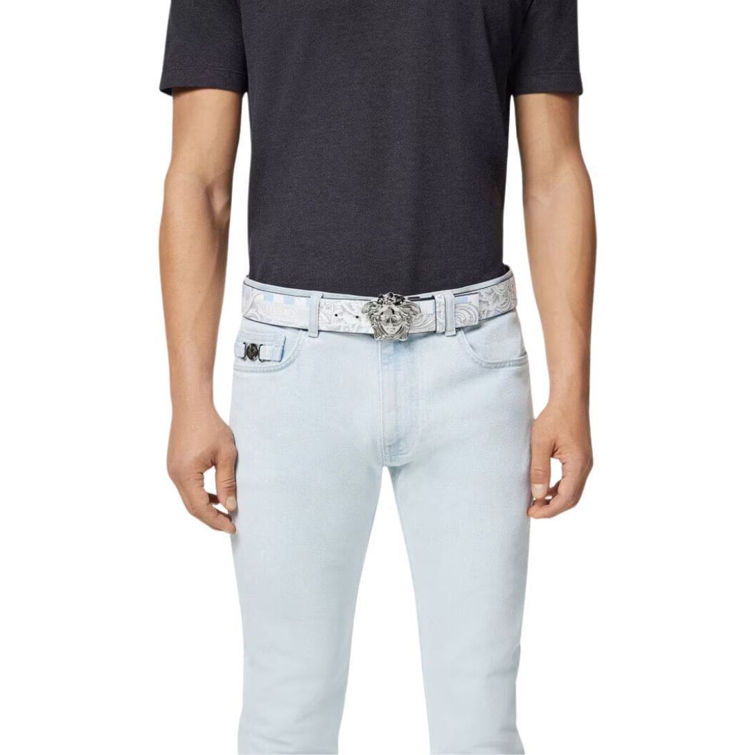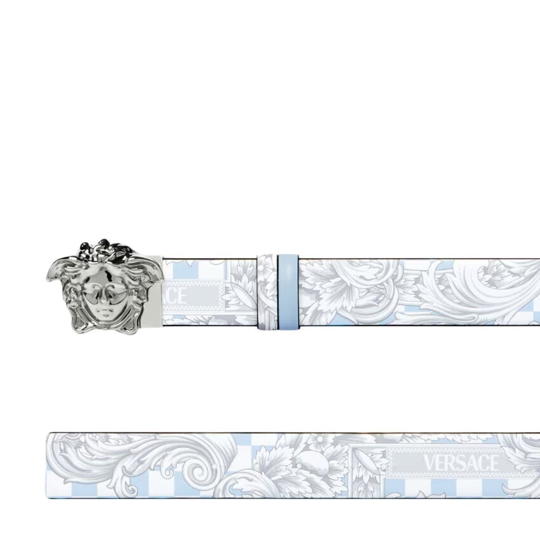 At the heart of the belt lies the Medusa emblem, an emblematic symbol of Versace that exudes power, allure, and a hint of mystique. The Medusa head, intricately embossed or adorned as a prominent buckle, commands attention, serving as a testament to the brand’s rich heritage and bold design aesthetic.