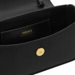 The focal point of the bag is undoubtedly the striking gold-tone Medusa emblem adorning the front flap. Symbolizing power, beauty, and allure, the Medusa motif is synonymous with the Versace brand and serves as a bold statement of luxury. The intricately designed emblem is meticulously crafted, with every detail meticulously executed to capture the essence of Versace’s rich heritage and timeless allure.