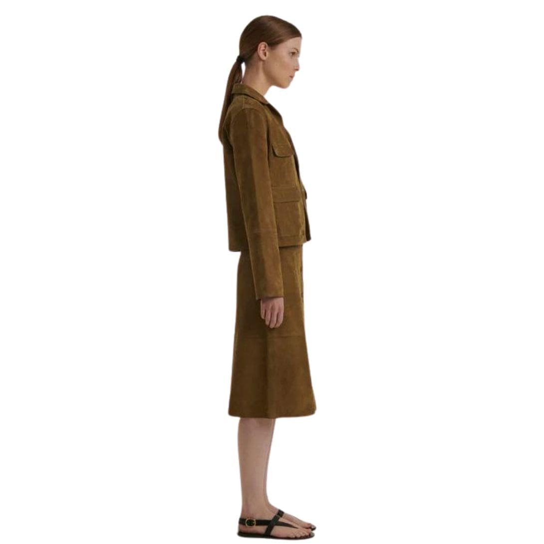 - Front button placket with velour leather-covered press studs allows you to wear the jacket open for a relaxed look or buttoned up for a more polished appearance.