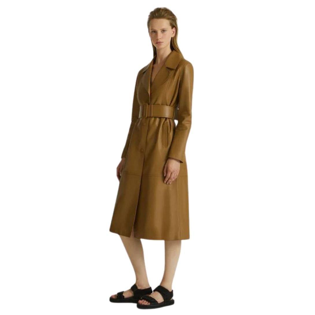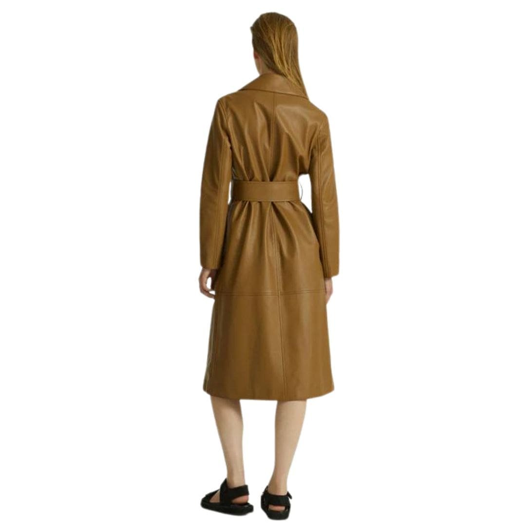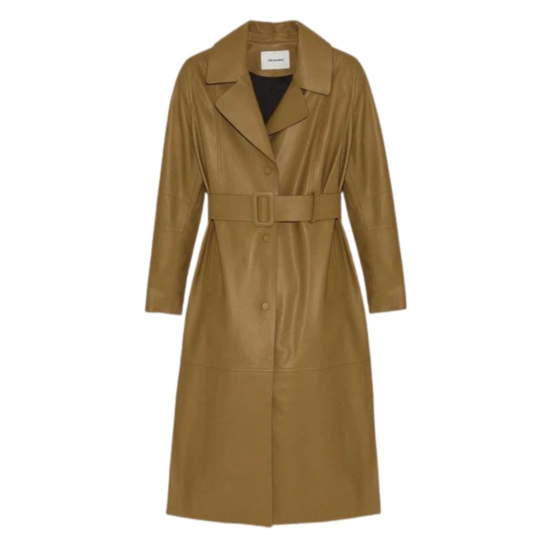 - Long belted trench coat with a fitted silhouette